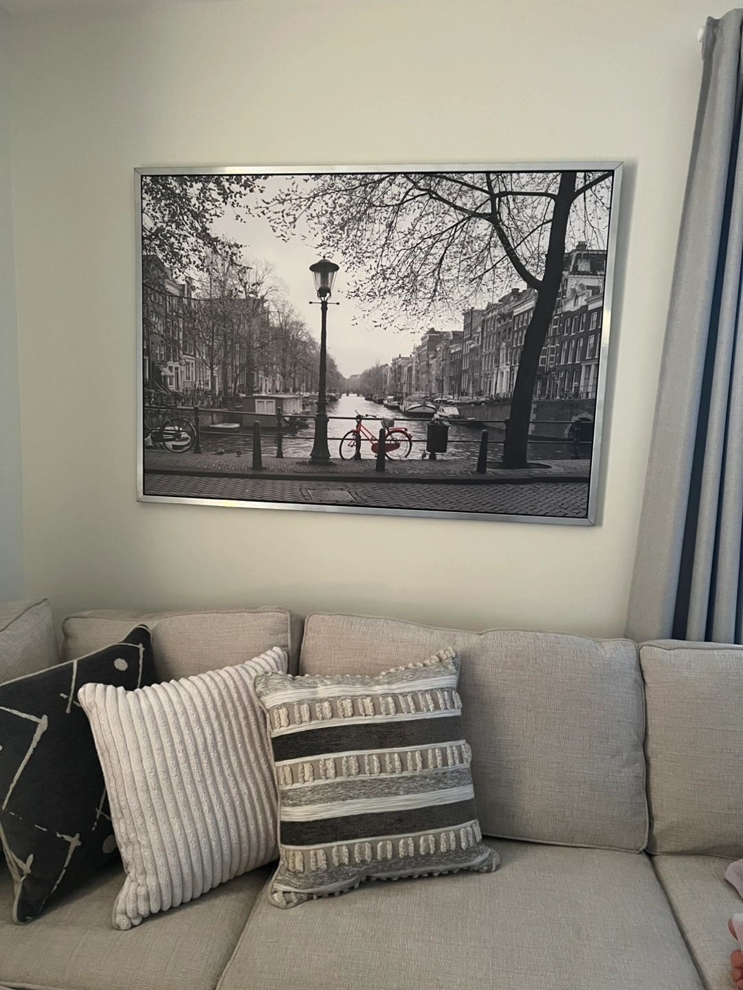 Large framed canvas print. Black and white photo of Amsterdam canal. Features red bicycle. Silver frame.