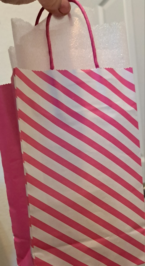 Porch pick-up (see stripey pink bag) at BACKDOOR.