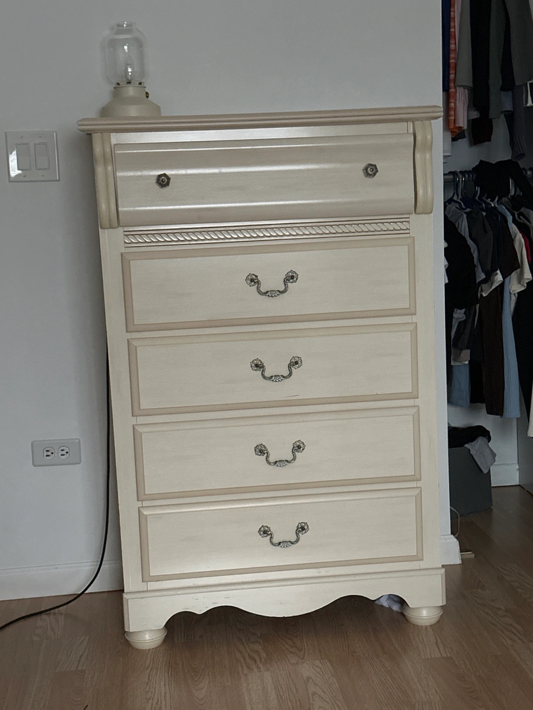 Beautiful off-white wooden chest of drawers. Five drawers with ornate silver handles. Features a curved base and top. Perfect for bedroom or entryway.