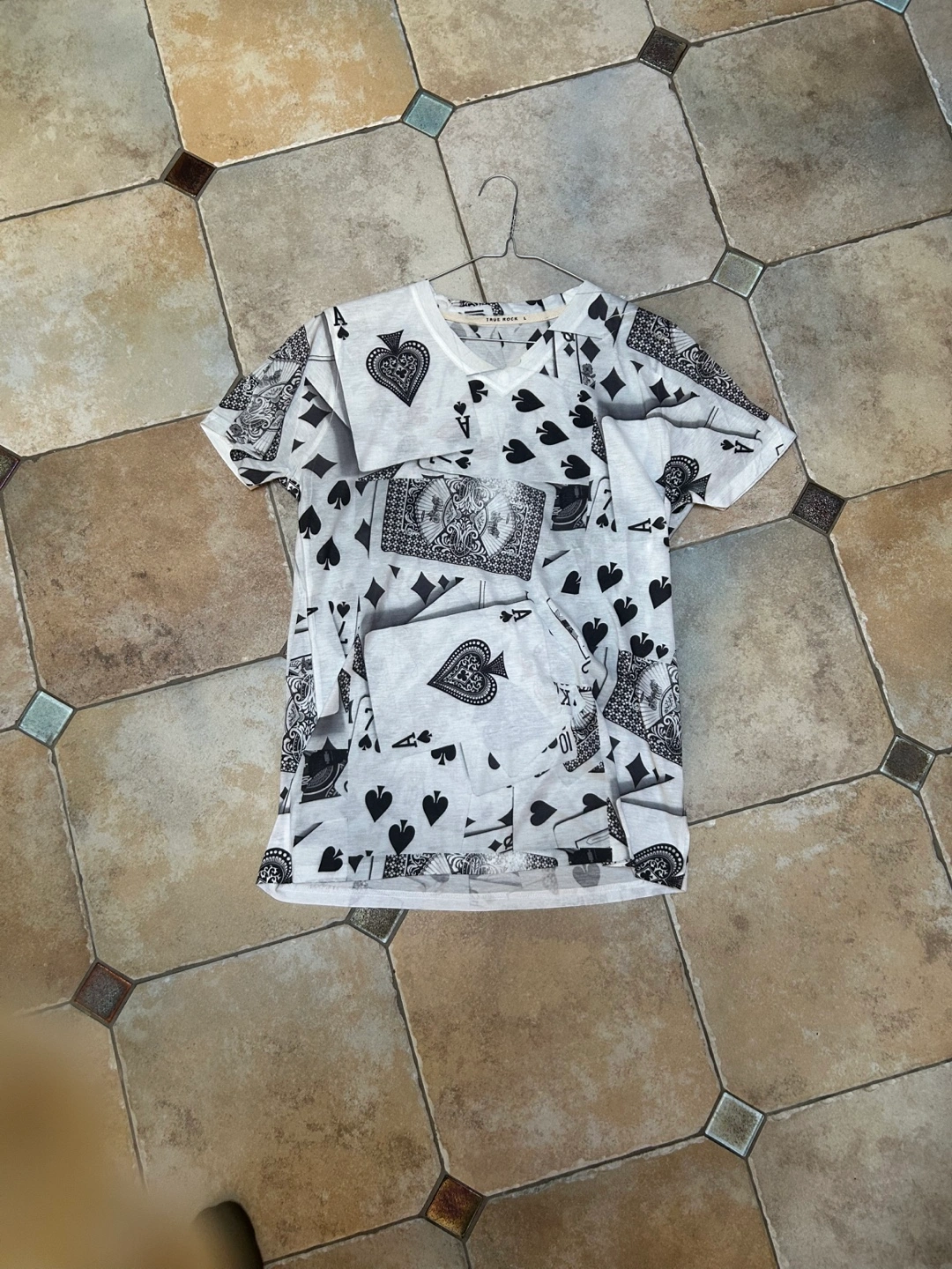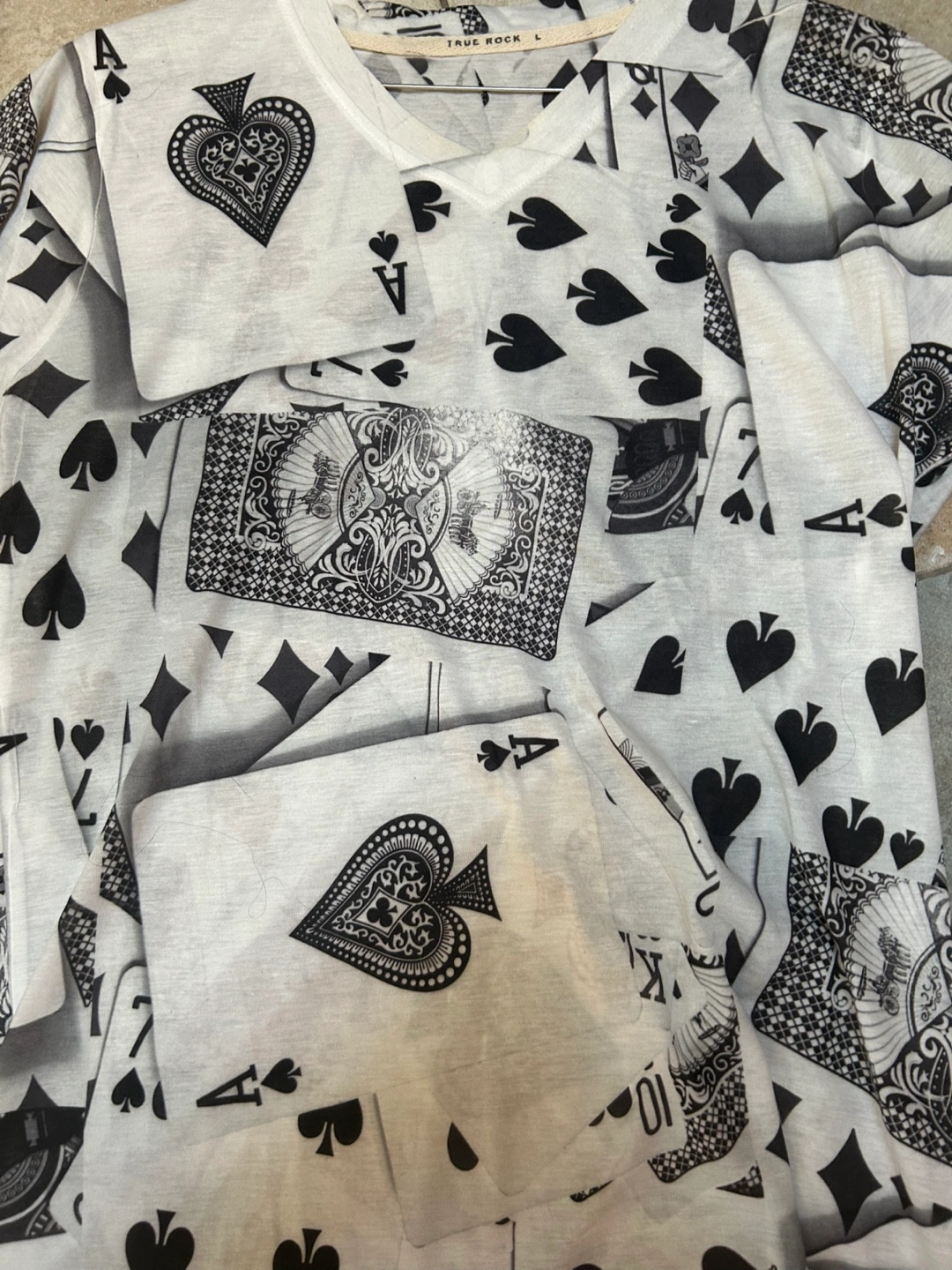 Men's V-neck short sleeve t-shirt. Playing card print. Size Large.fun T shirt in cotton polyester blend.