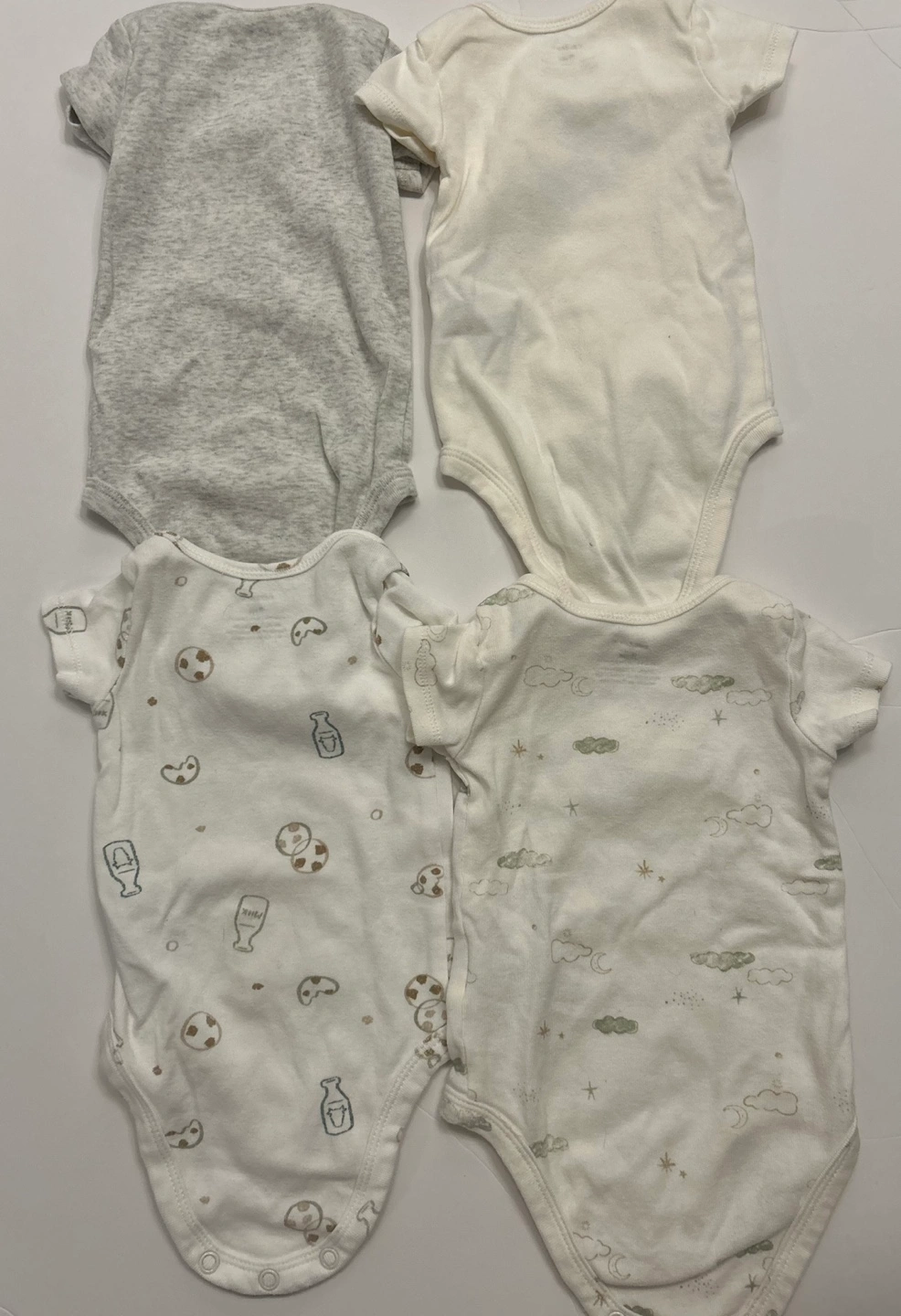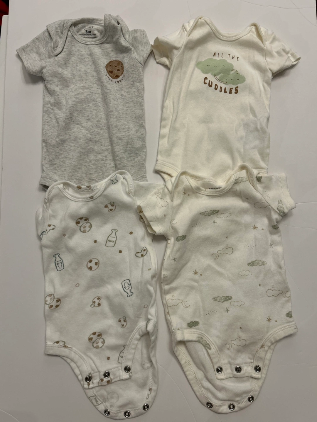 Four Carter’s adorable baby bodysuits. Neutral colours and prints. Short sleeves. Snap closures. Size 3 months. Gently used