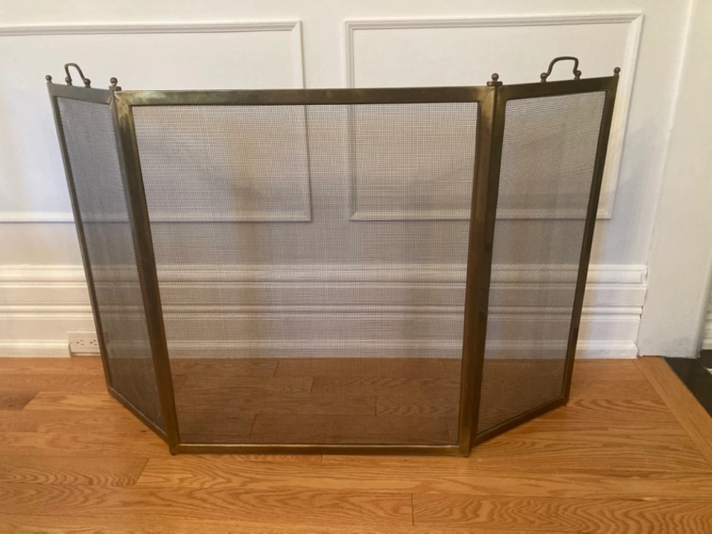 Three-panel brass fireplace screen. Features a mesh design and decorative handles. Suitable for smaller fireplaces.