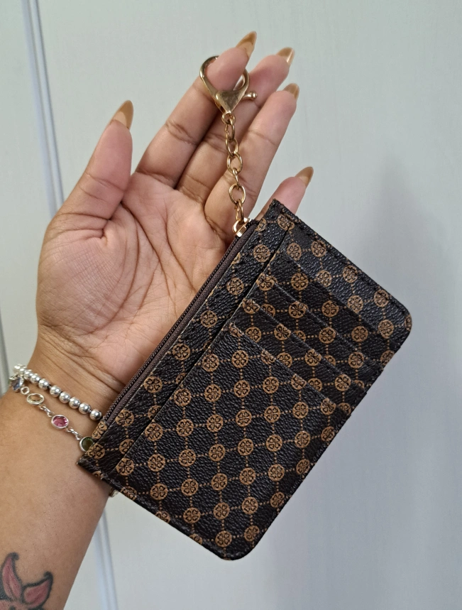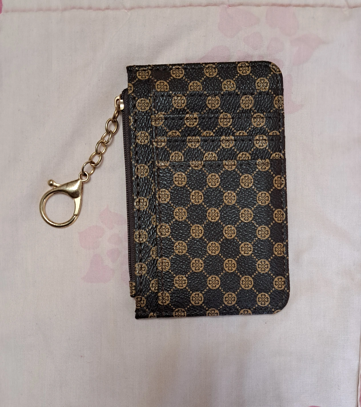 Small zippered card holder. Features multiple card slots witg zipper compartment for coins and a gold-coloured metal keychain. Brown with gold pattern. Compact and convenient.