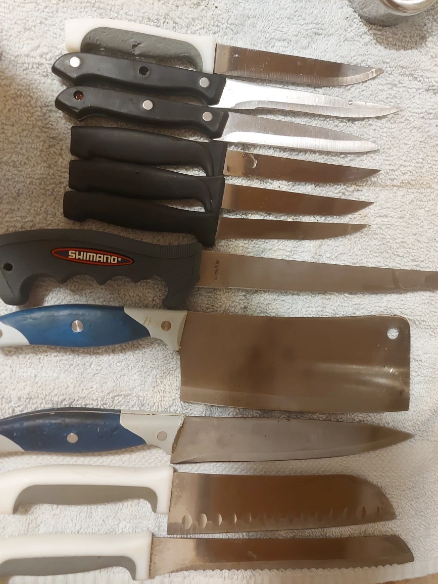 16 Kitchen Knives. Mismatched. Take All. See both pictures. Some may need sharpening, but they all work.