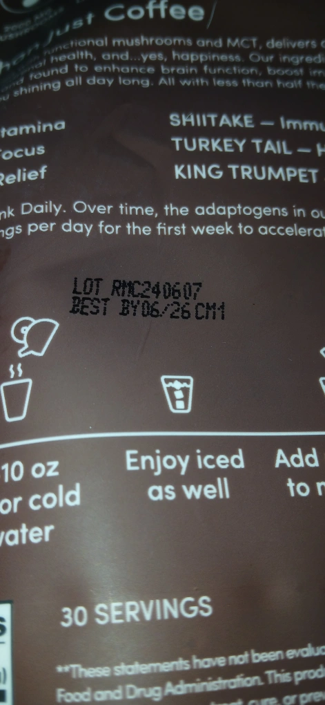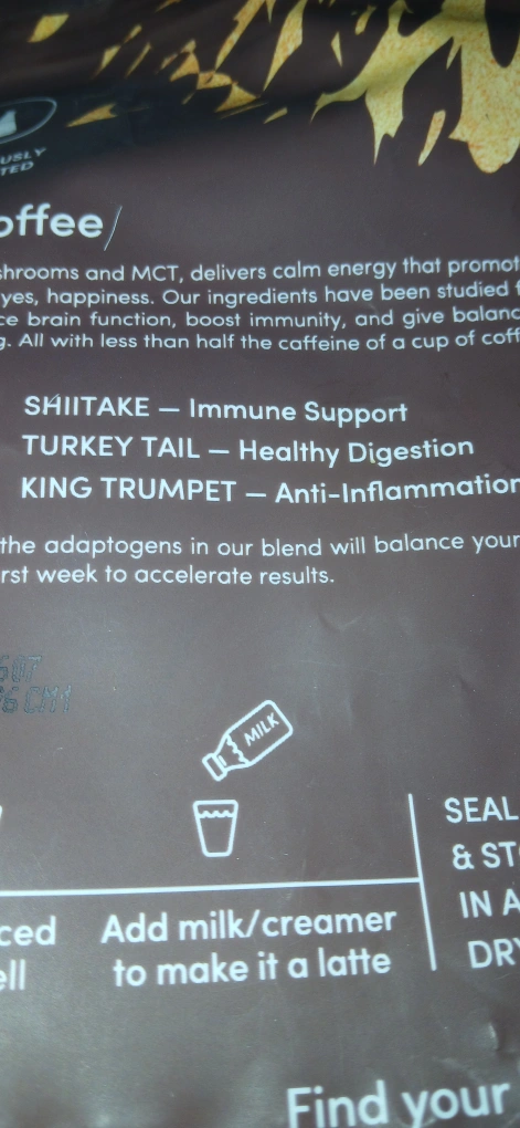 Organic mushroom coffee blend. Promotes calm energy. Includes cordyceps, lion's mane, reishi, shiitake, turkey tail, and king trumpet mushrooms. 2000 mg mushrooms per serving. Vegan. Mix 1 tbsp with 8-10 oz hot or cold water. Enjoy iced or as a latte 6 packs left
