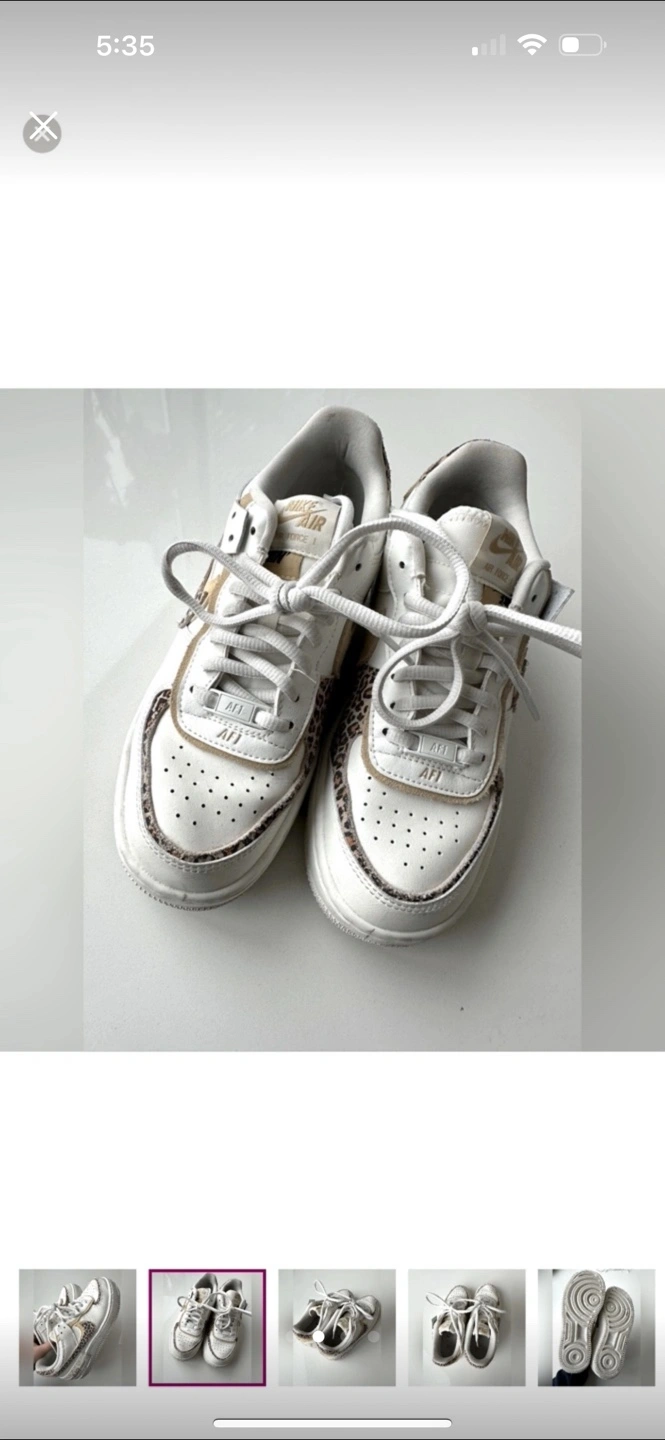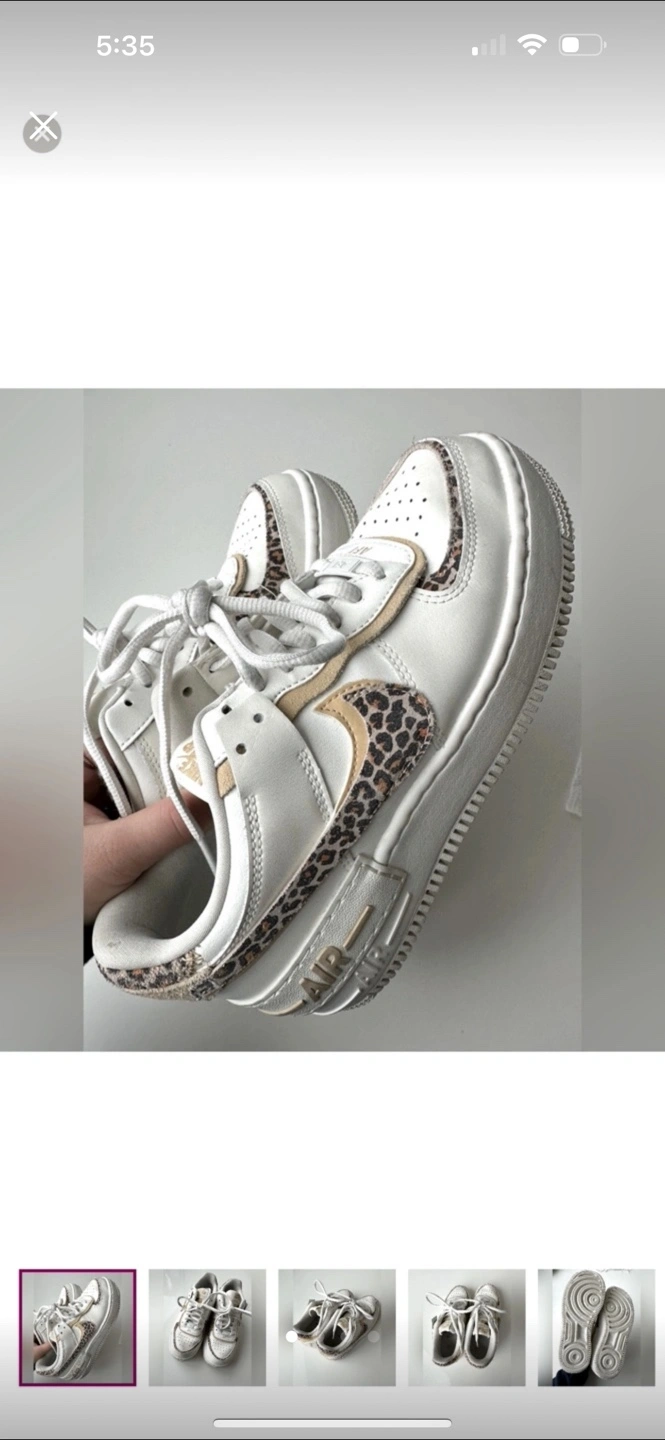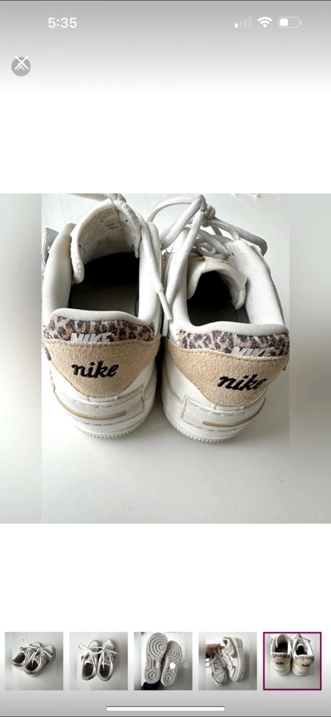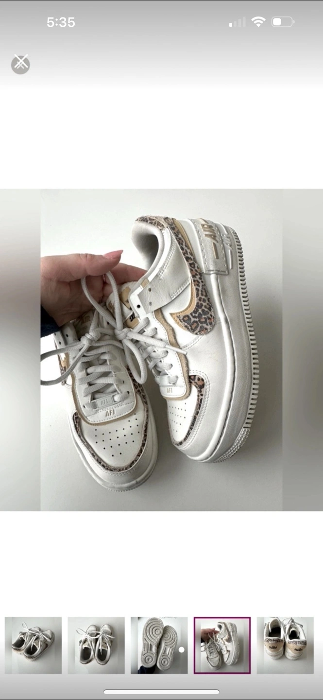 Women's Nike Air Force 1 Shadow sneakers. White leather upper. Leopard print accents. Platform sole. Lace-up closure. Pre-owned.