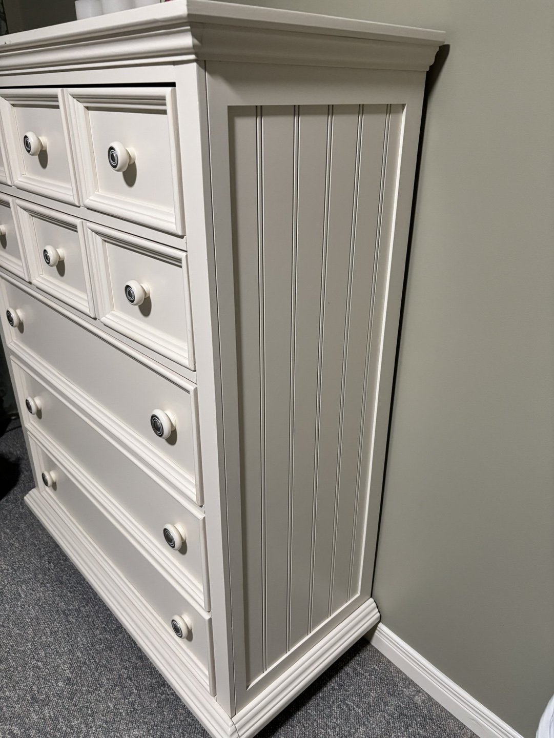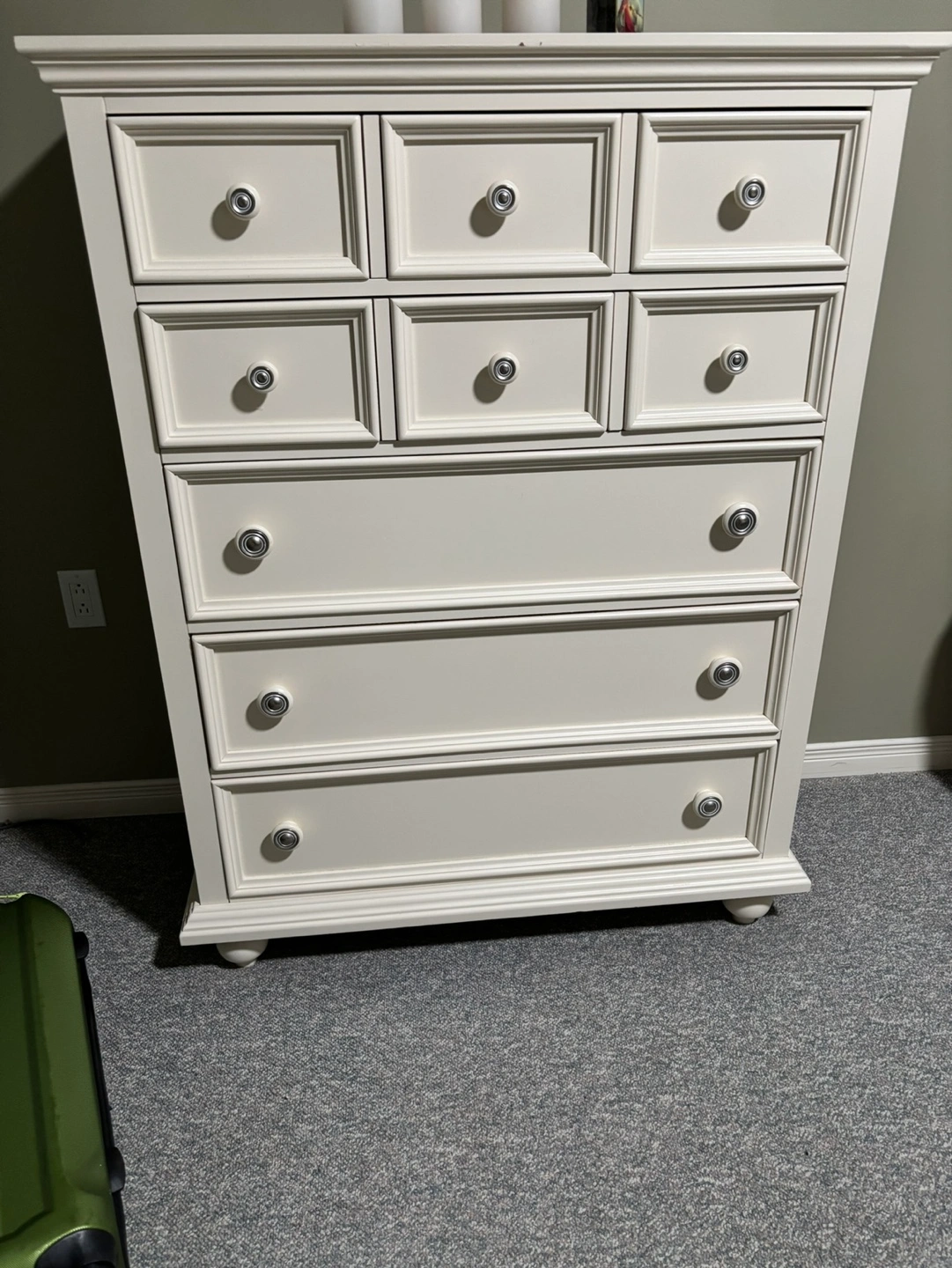 Eight-drawer tallboy dresser. Off-white finish. Silver knobs. Solid wood. Heavy. Good used condition. One of the legs needs to be reinforced. As is.