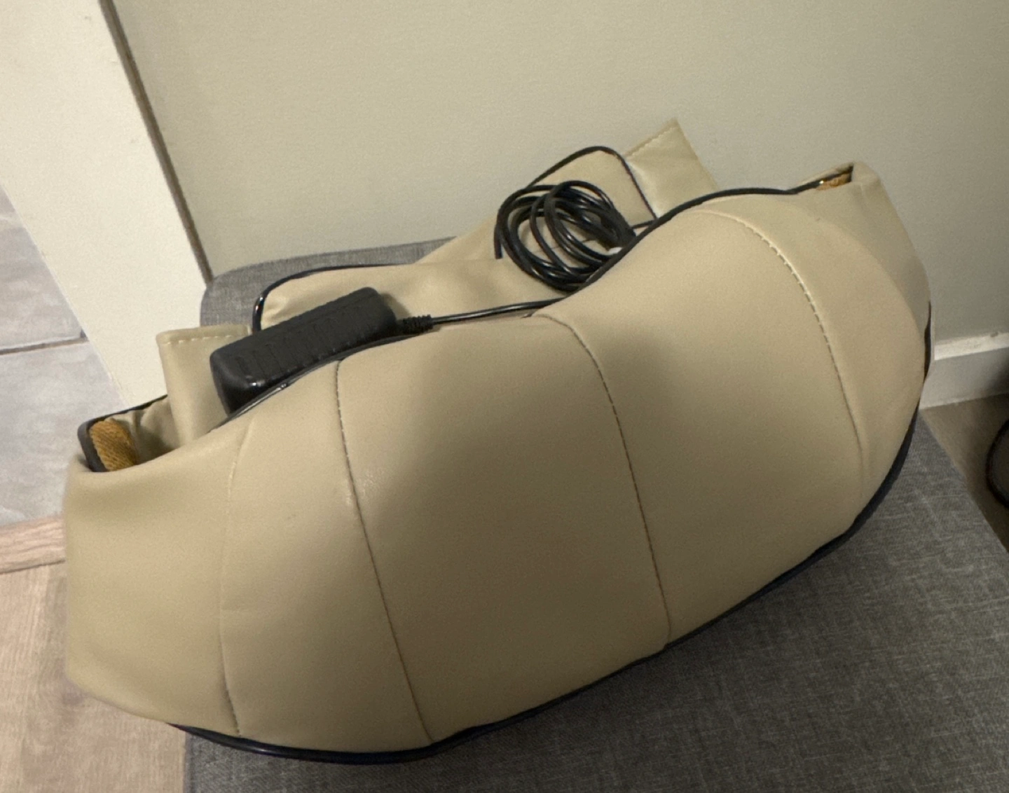 Electric shiatsu massager for neck and shoulders. Beige colour. Includes power adapter. Portable and easy to use.