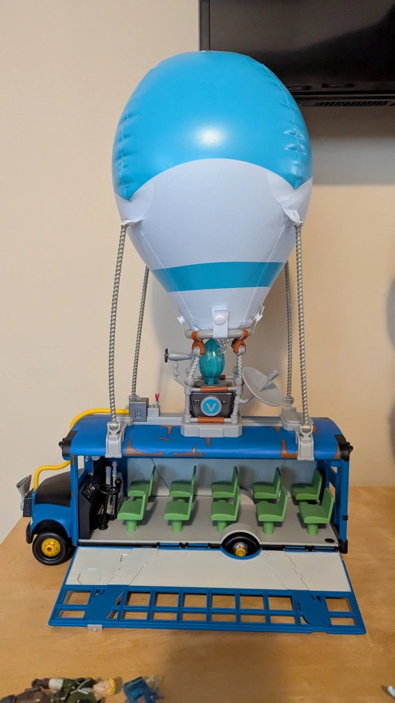 Large Battle Bus playset. Includes hot air balloon and two action figures. Great condition. Collectible.