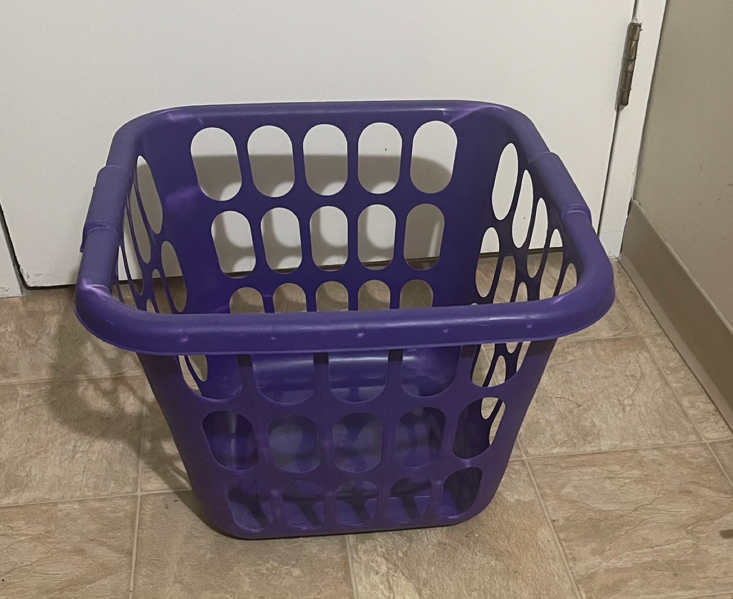 Purple plastic laundry basket. Open design for good ventilation. Durable plastic construction. Perfect for laundry or storage. From smoke-free, pest-free, and pet-free home. Very good condition.