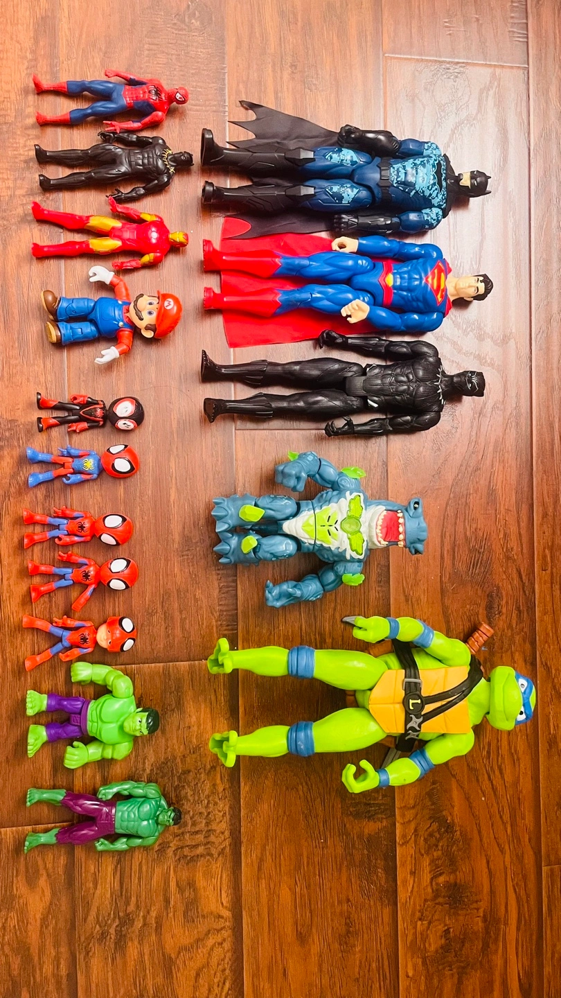 Large collection of action figures. Includes Spiderman, Superman, Batman, Iron Man, Mario, Hulk, and Teenage Mutant Ninja Turtle figures. Various sizes and styles. Great for collectors or kids.