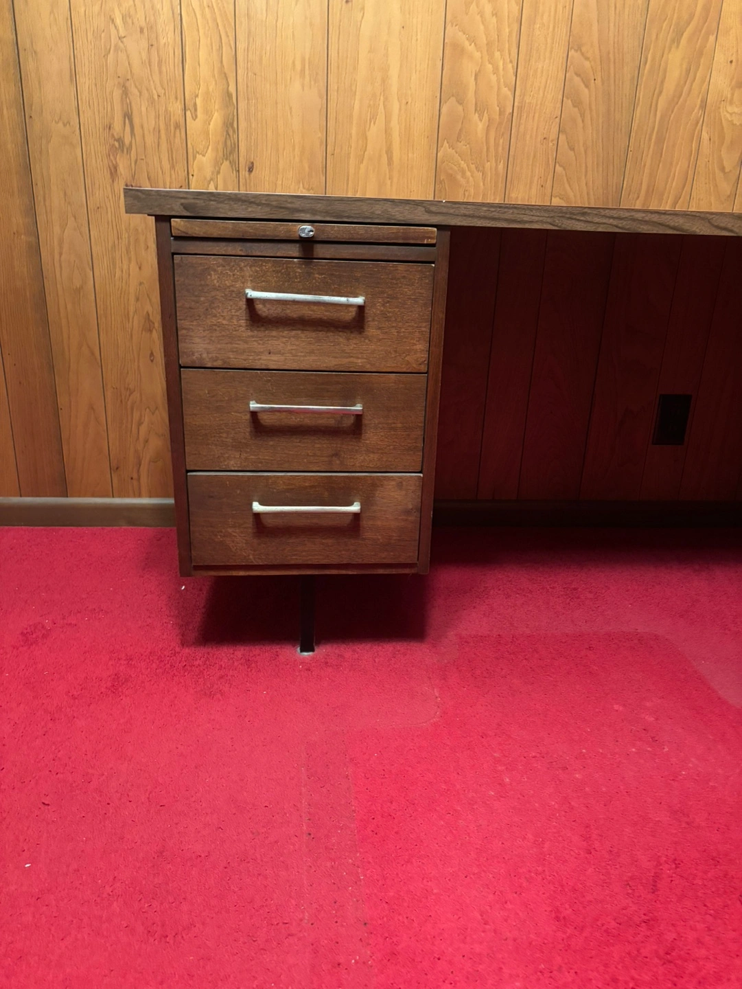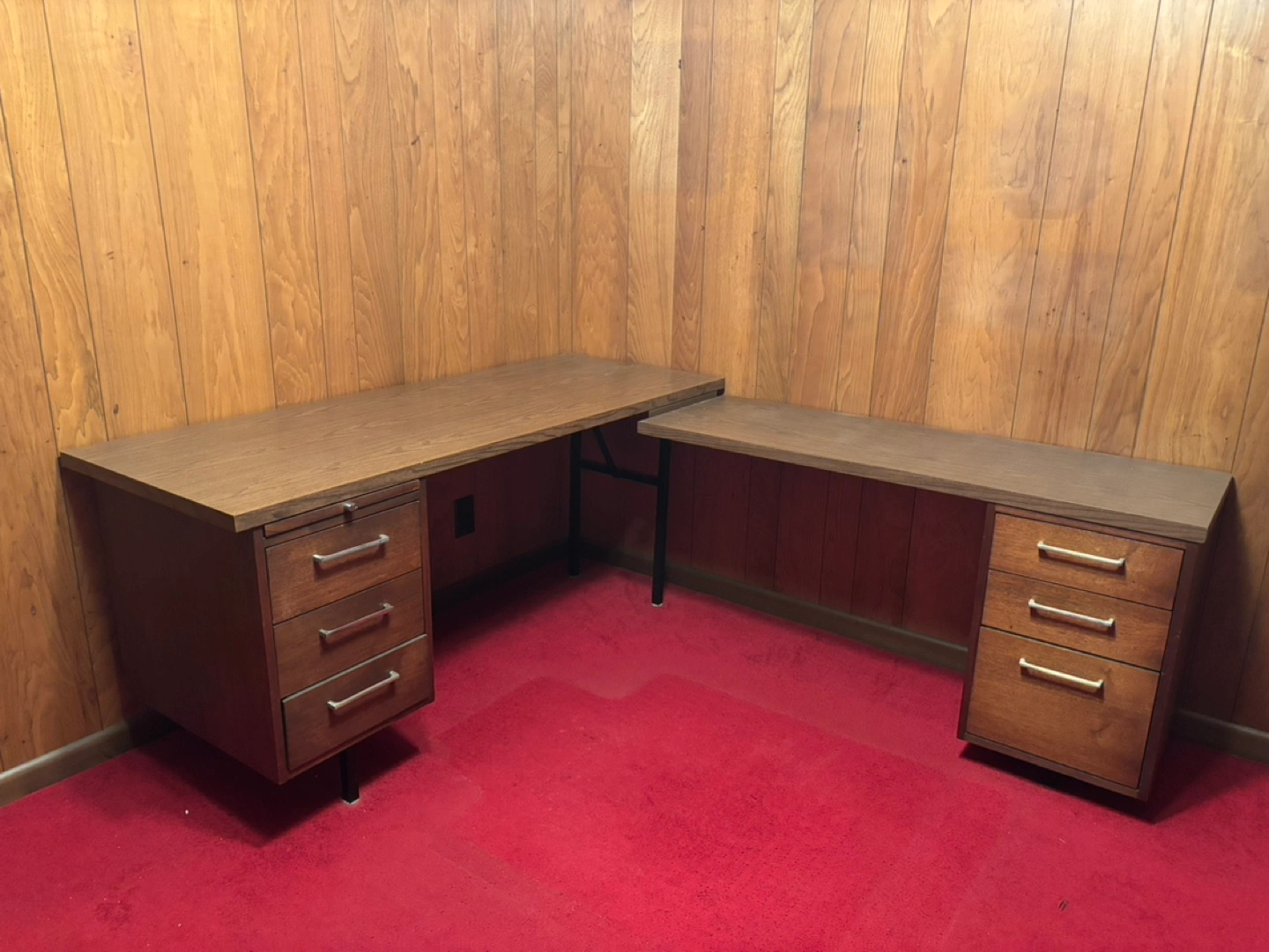 L-shaped desk, 2 sets of three drawers per side. Black executive chair, swivel and rolling. Good for home office. Sturdy with lots of room for spreading out. Includes desk and chair. Garden City area