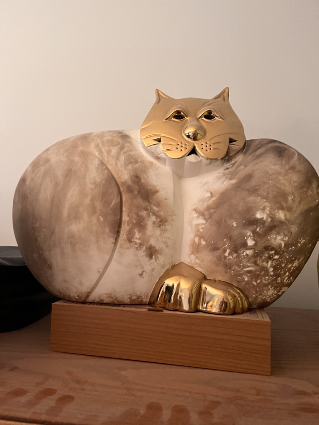 Unique ceramic cat figurine. Gold accents on face and paws. Sits on a wooden base. Collectible item.