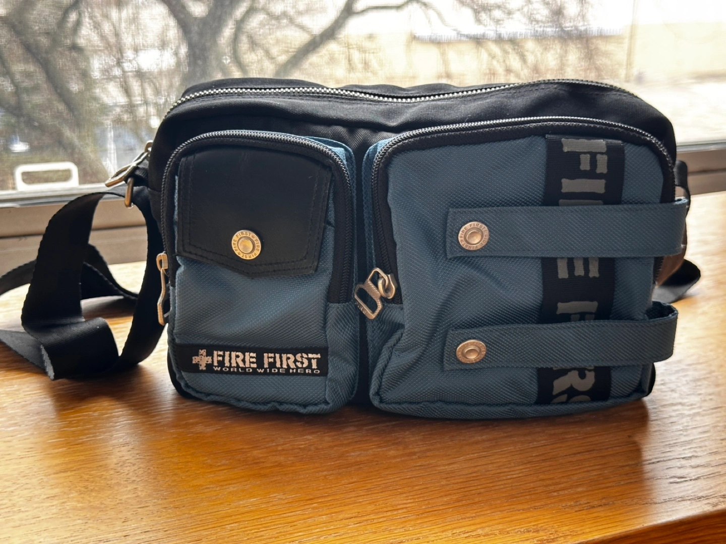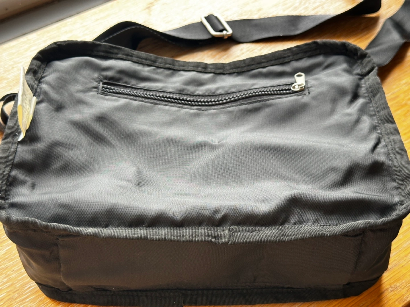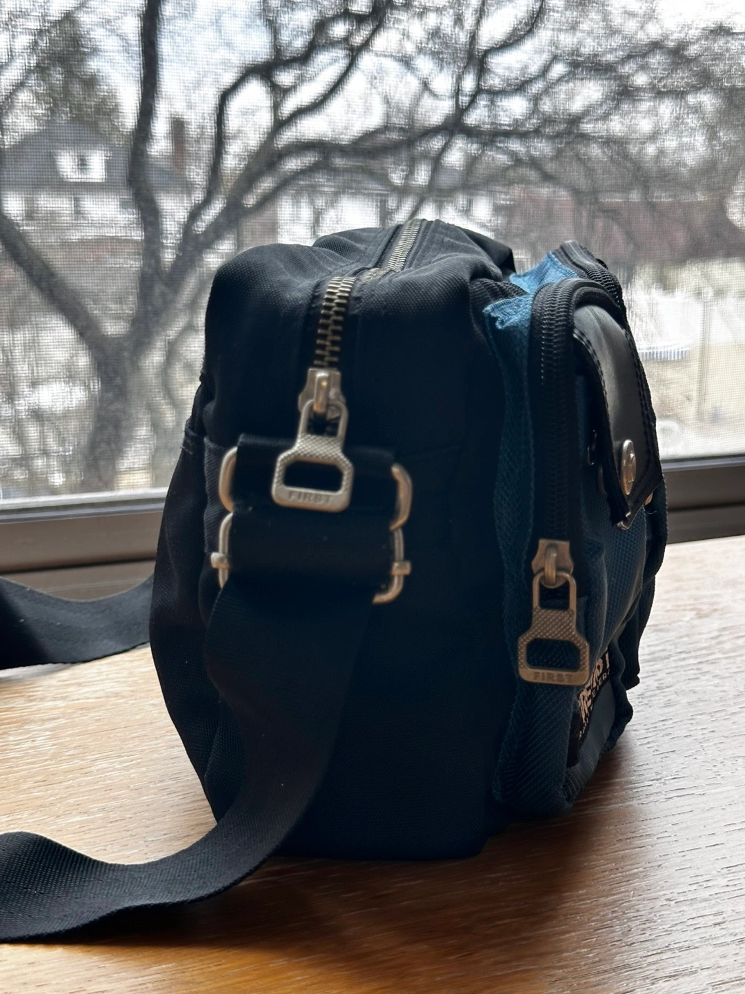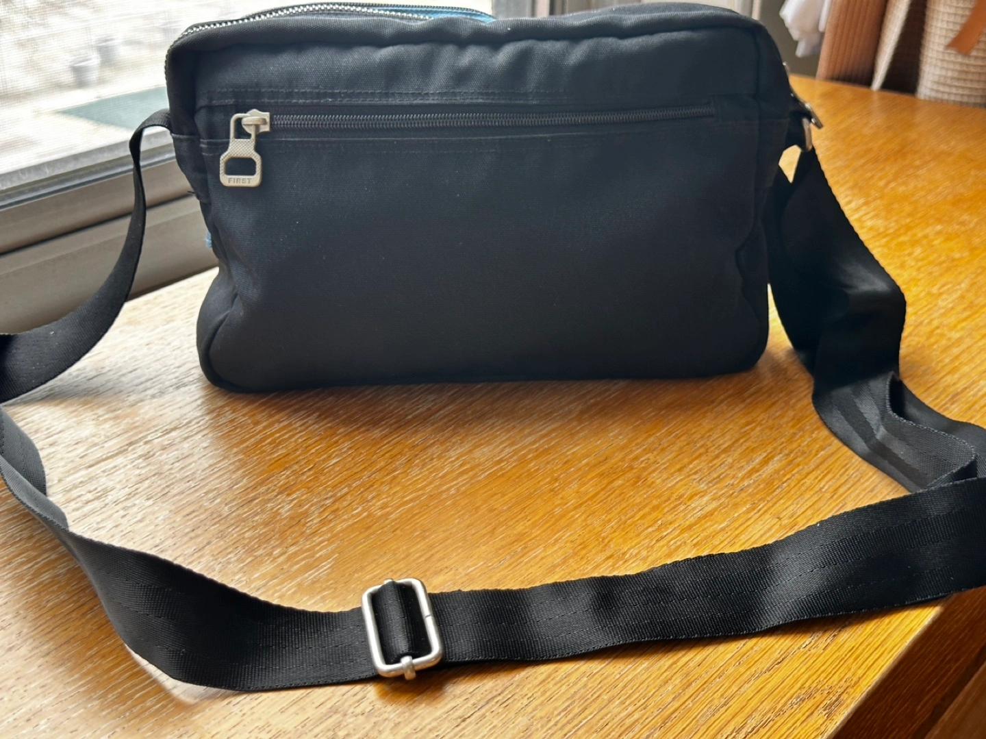 Black and blue nylon shoulder bag. Multiple zippered compartments. Adjustable strap. Great for everyday use.