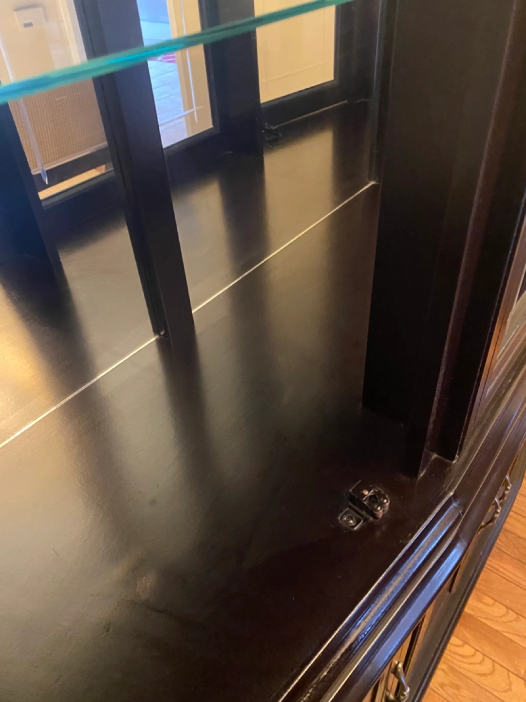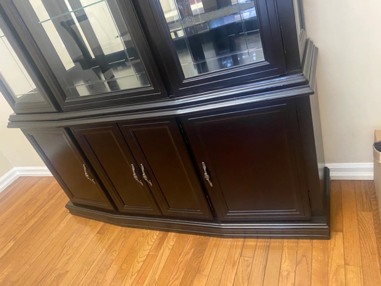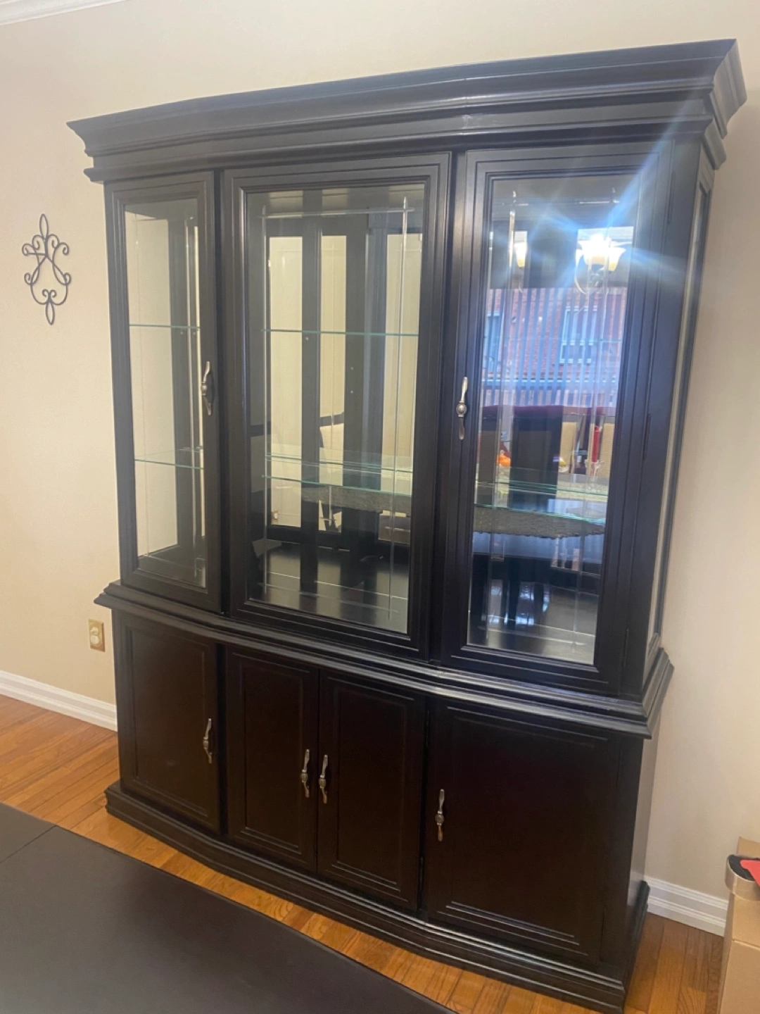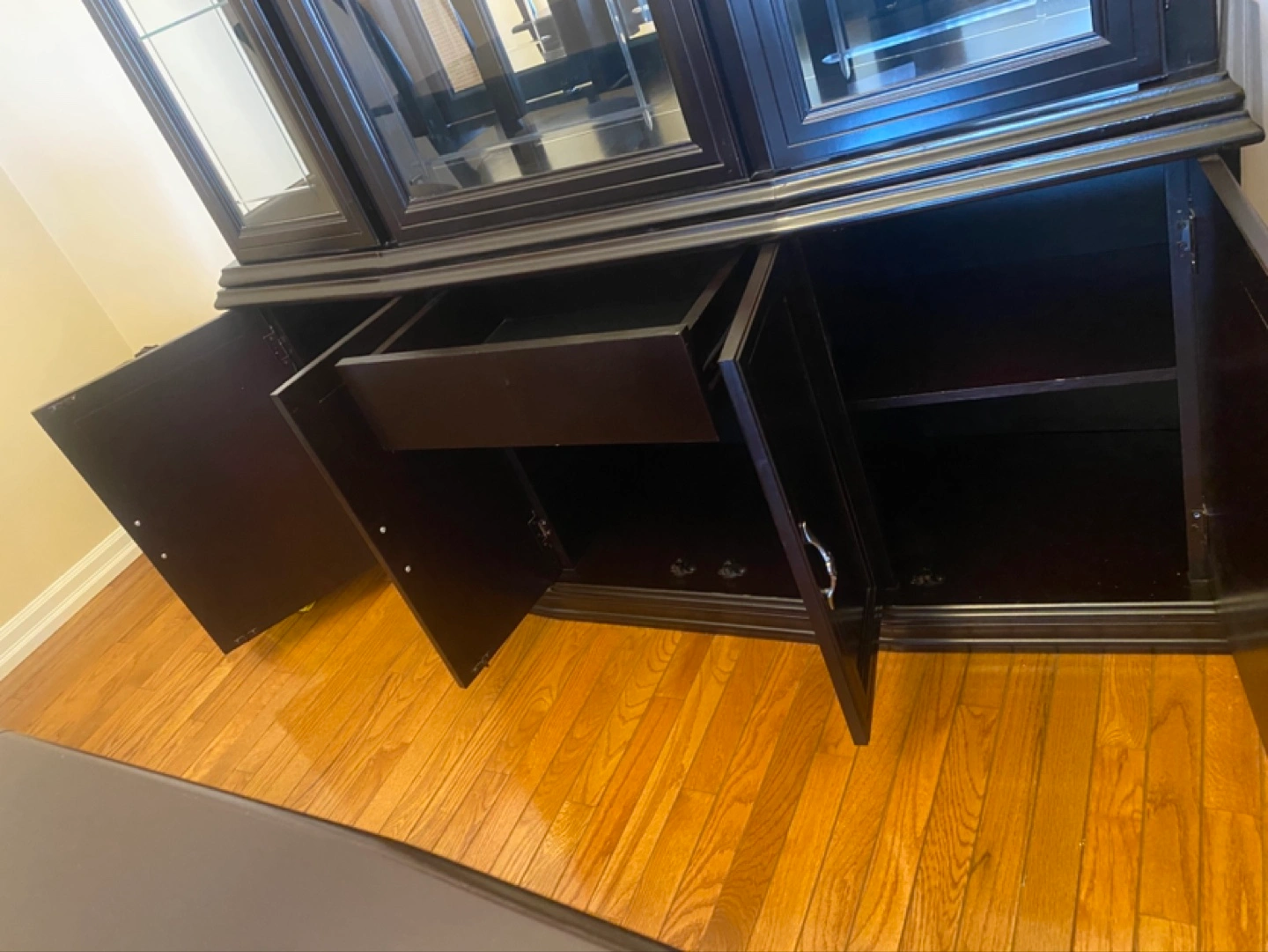 Large black wooden cabinet. Glass doors and shelves. Four lower cabinets with doors. Elegant design. Great storage.