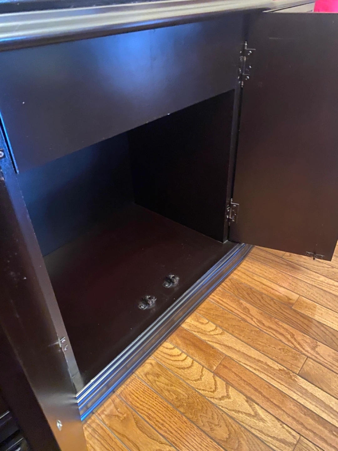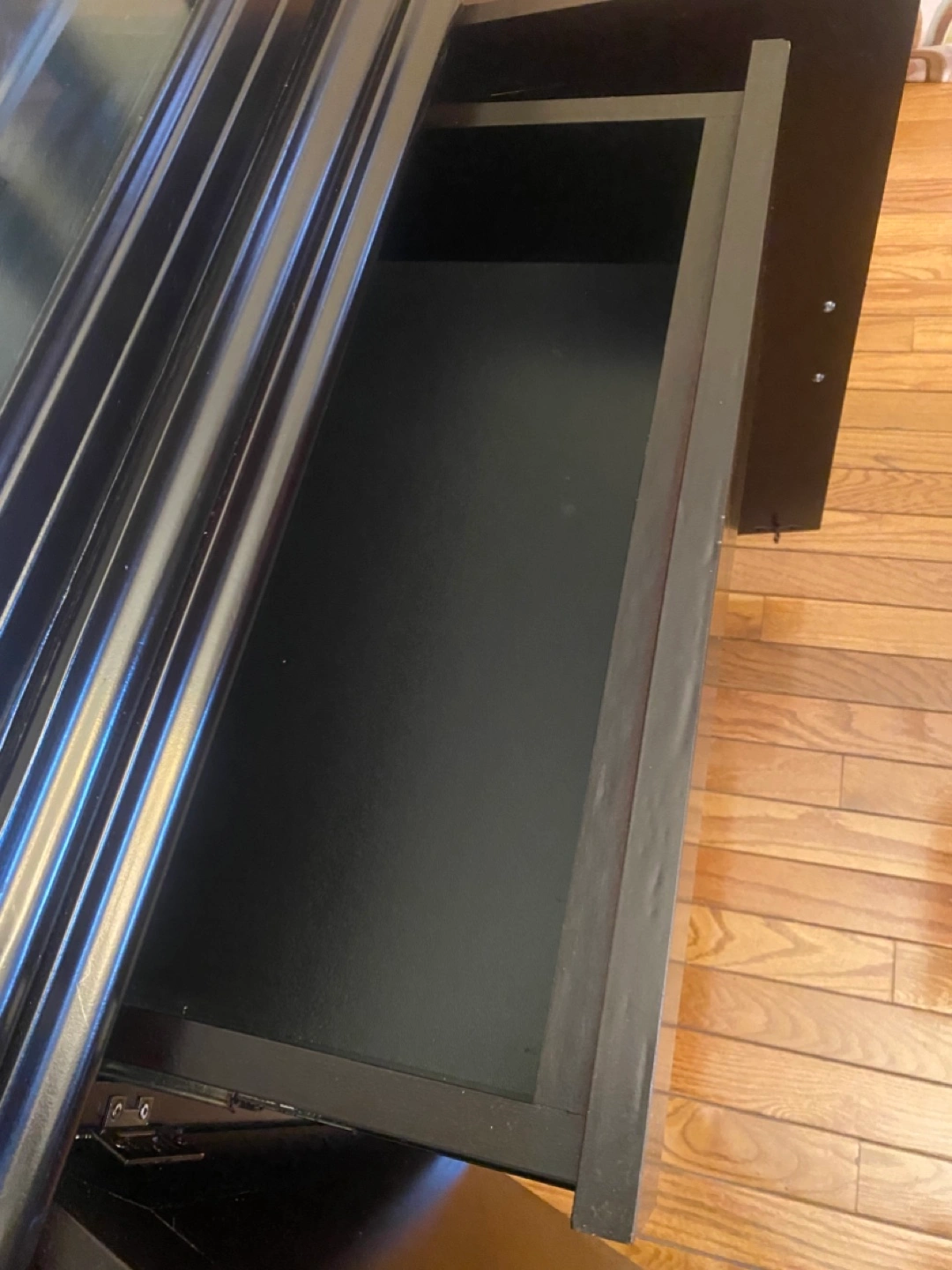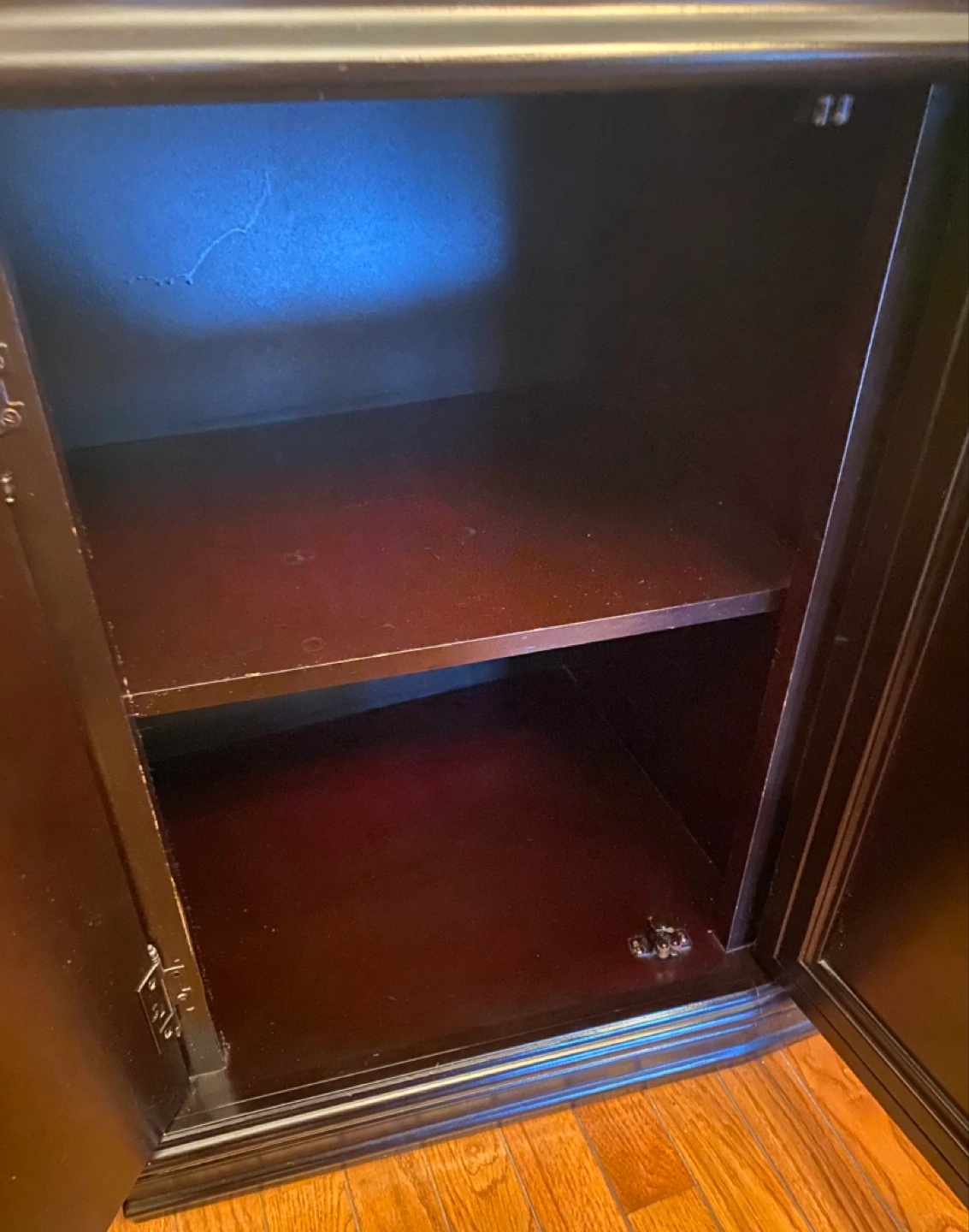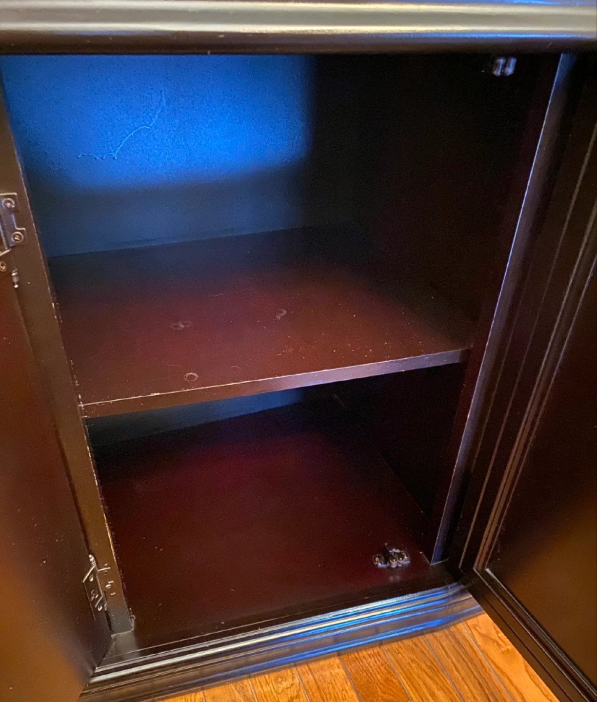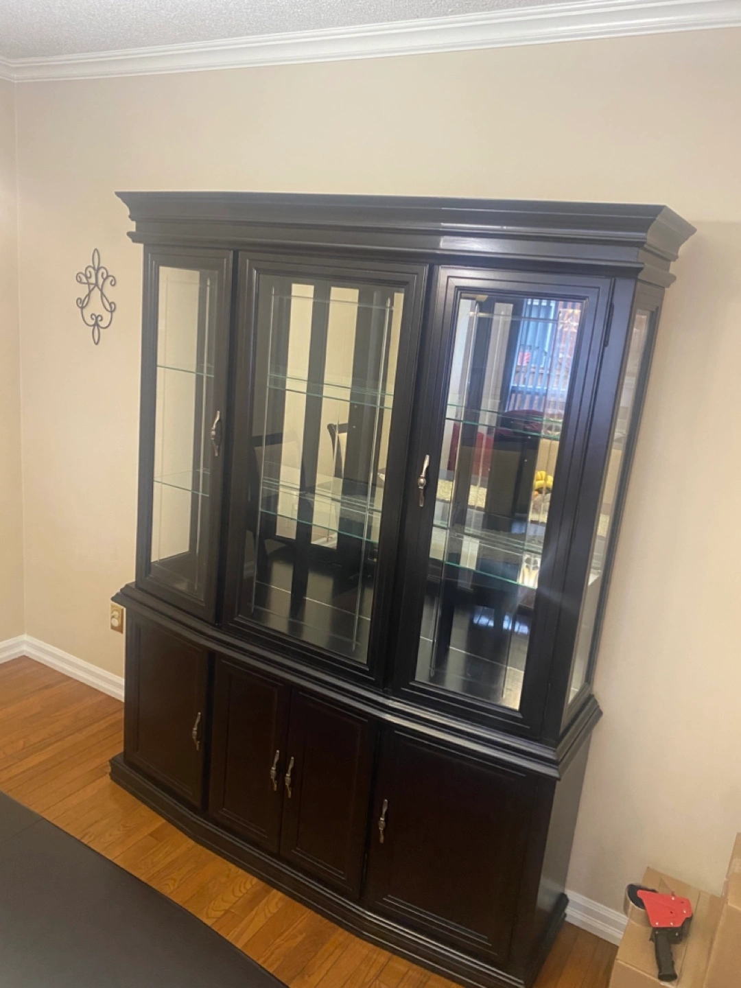 Large black wooden cabinet. Glass doors and shelves. Four lower cabinets with doors. Elegant design. Great storage.