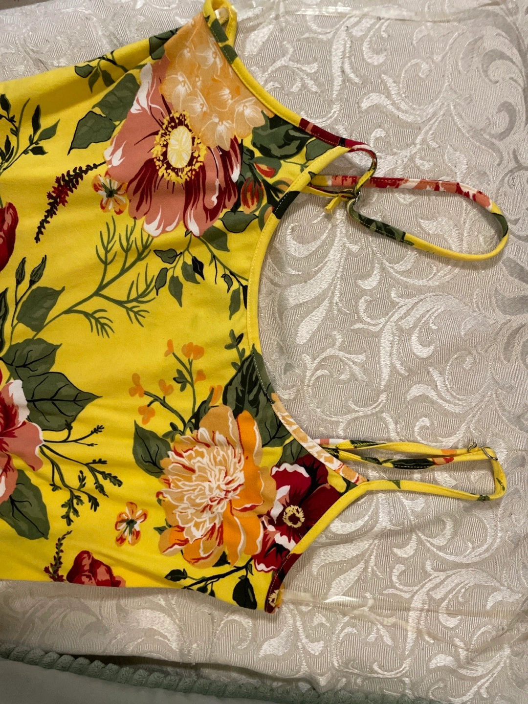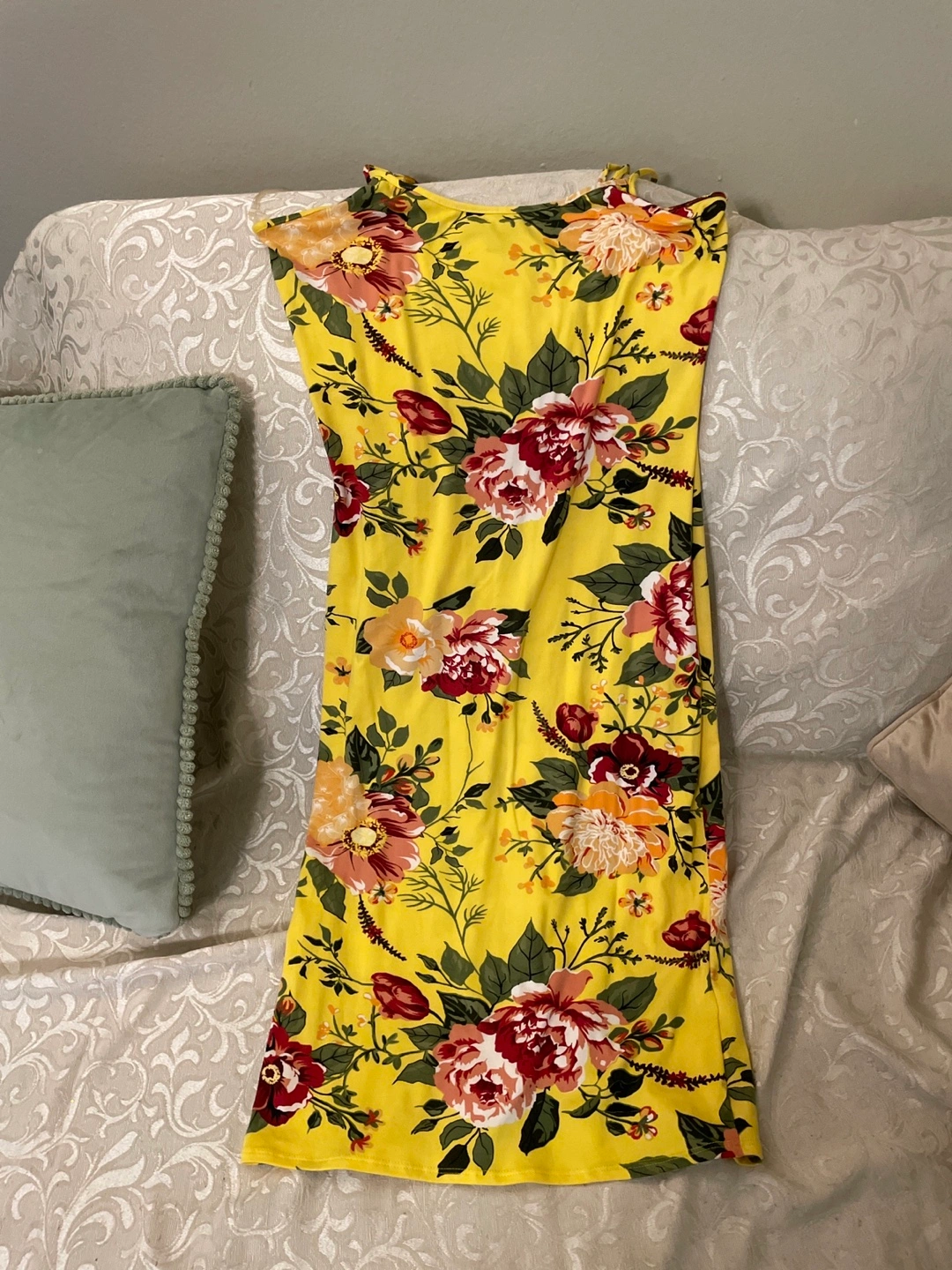 475RUNS SMALL Beautiful yellow midi dress. Floral print. Spaghetti straps. Great for summer.