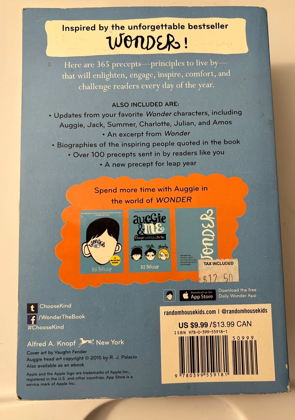 Paperback book. 365 precepts – principles to live by. Includes quotes about courage, friendship, love, and kindness. Features favourite characters from Wonder. New York Times bestseller. 😊