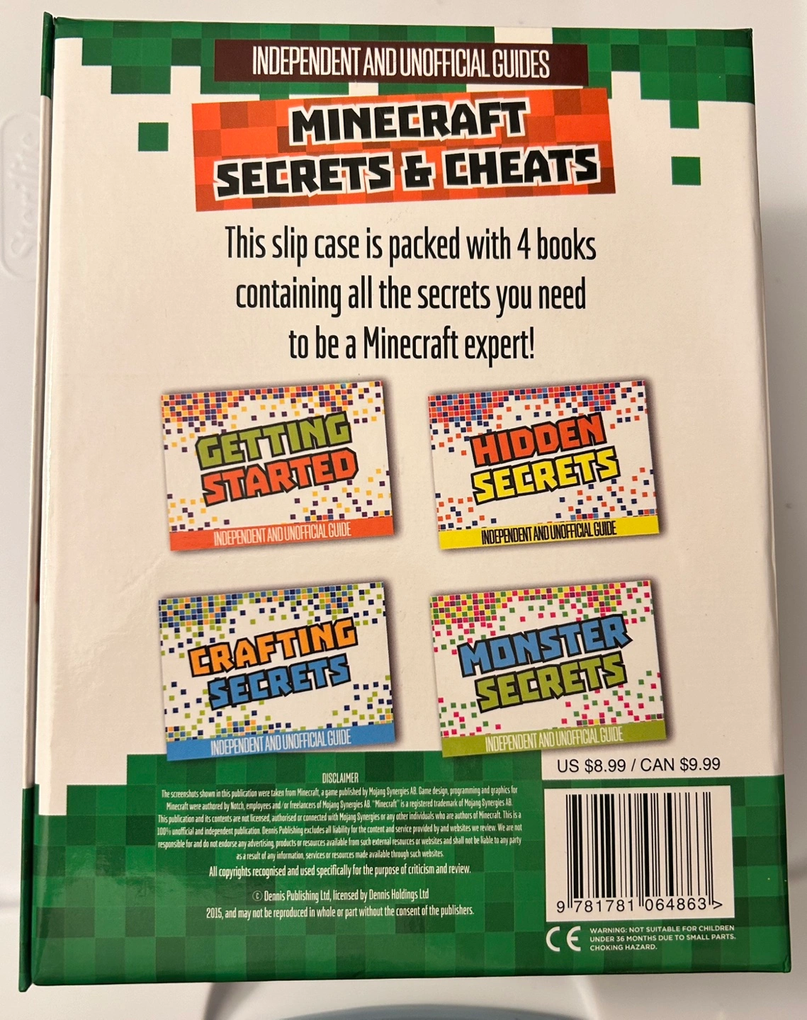 Four book slipcase. Independent and unofficial guides. Contains secrets and cheats to help you become a Minecraft expert. Getting Started, Hidden Secrets, Crafting Secrets, and Monster Secrets. $5 for all 😊