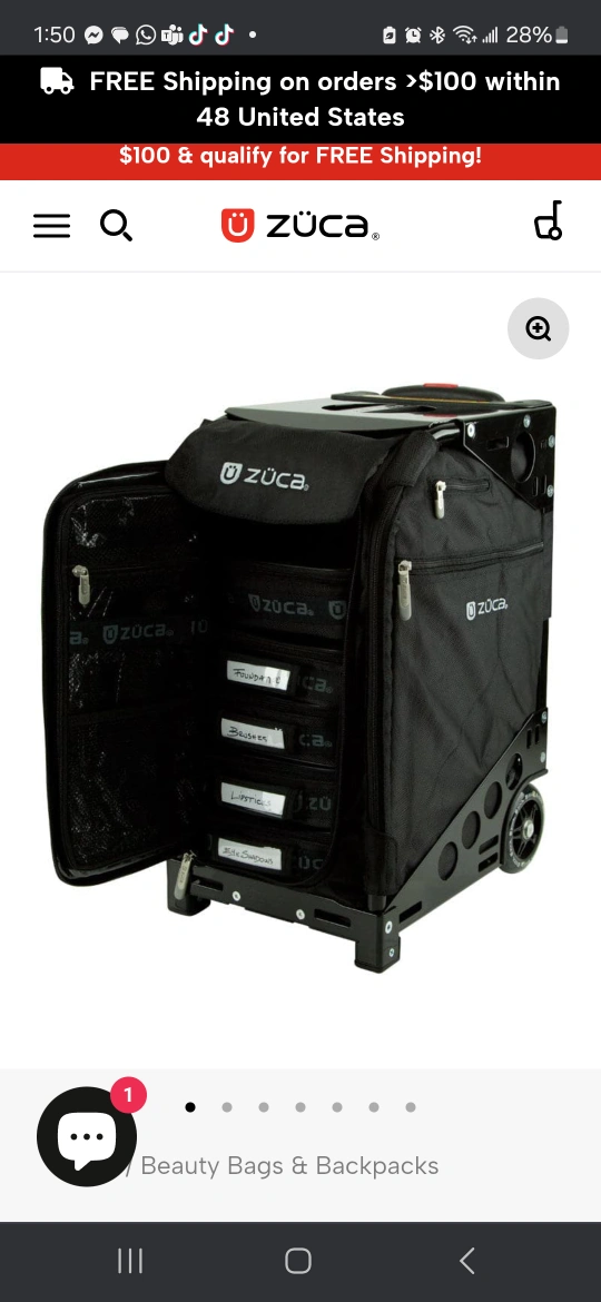 Black rolling makeup case. Multiple compartments. Wheels and handle. Great for travel.