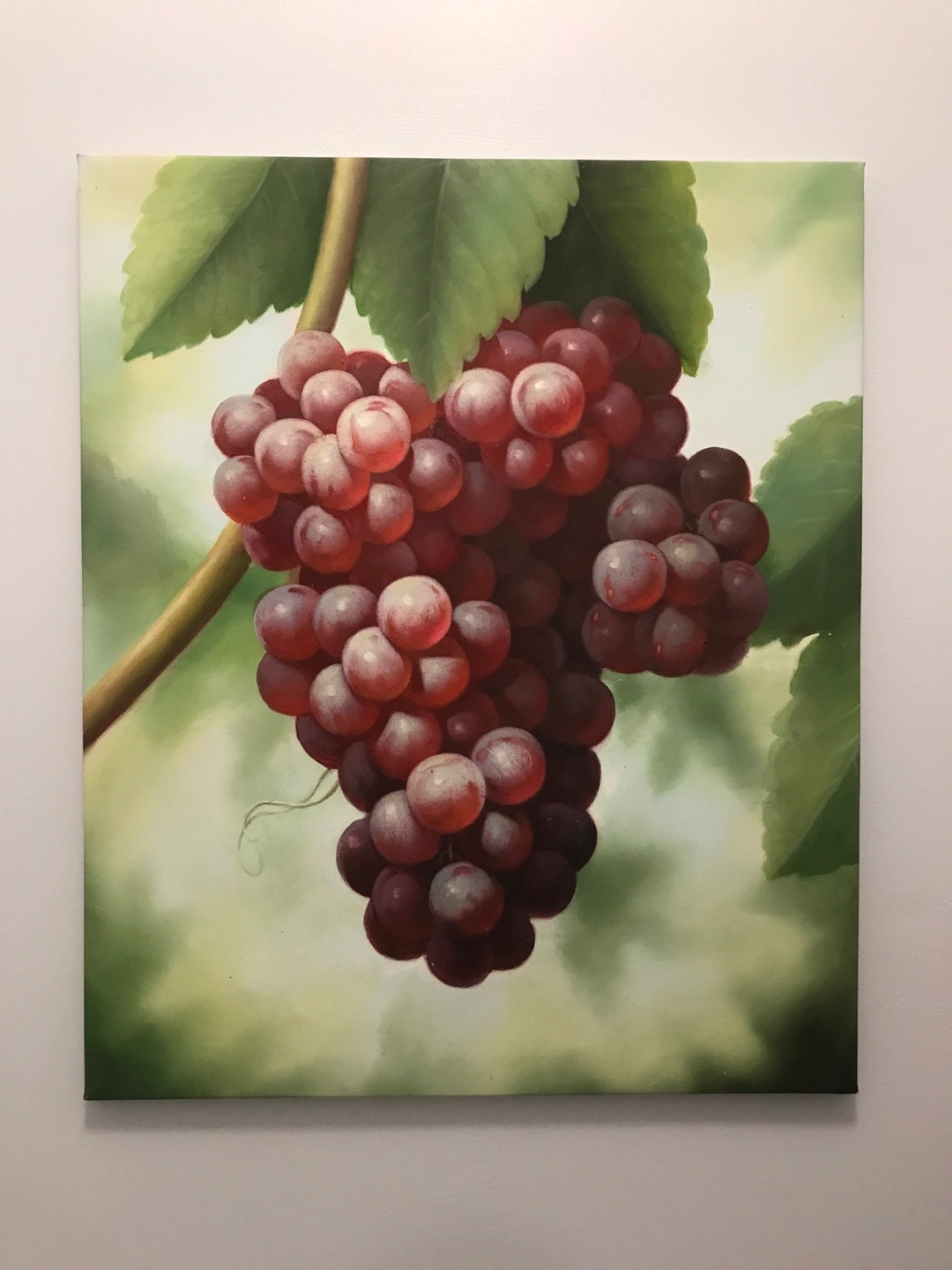 Oil painting on canvas. Depicts a cluster of red grapes on the vine. Leaves and vine included. Beautiful colours.