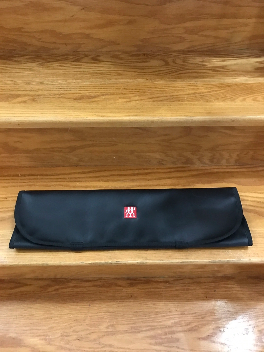 Black knife roll. Multiple slots for knives. Flap closure. Durable material. Compact and portable. Never used.
