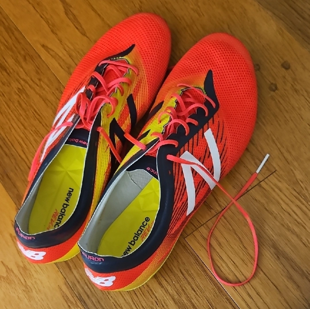 Men's New Balance Furon v6+ Firm Ground soccer cleats. Size 11.5 US. Red, yellow, and black colour scheme. Includes shoe bag.