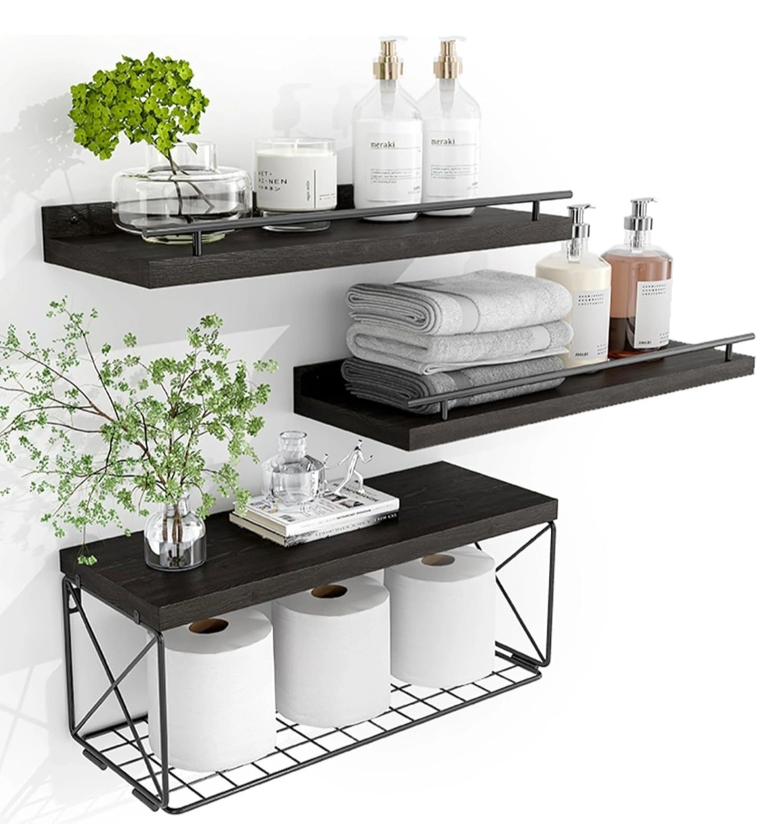 Set of three wall shelves with Metal Guardrail and Storage Basket, Black, Wood & Metal