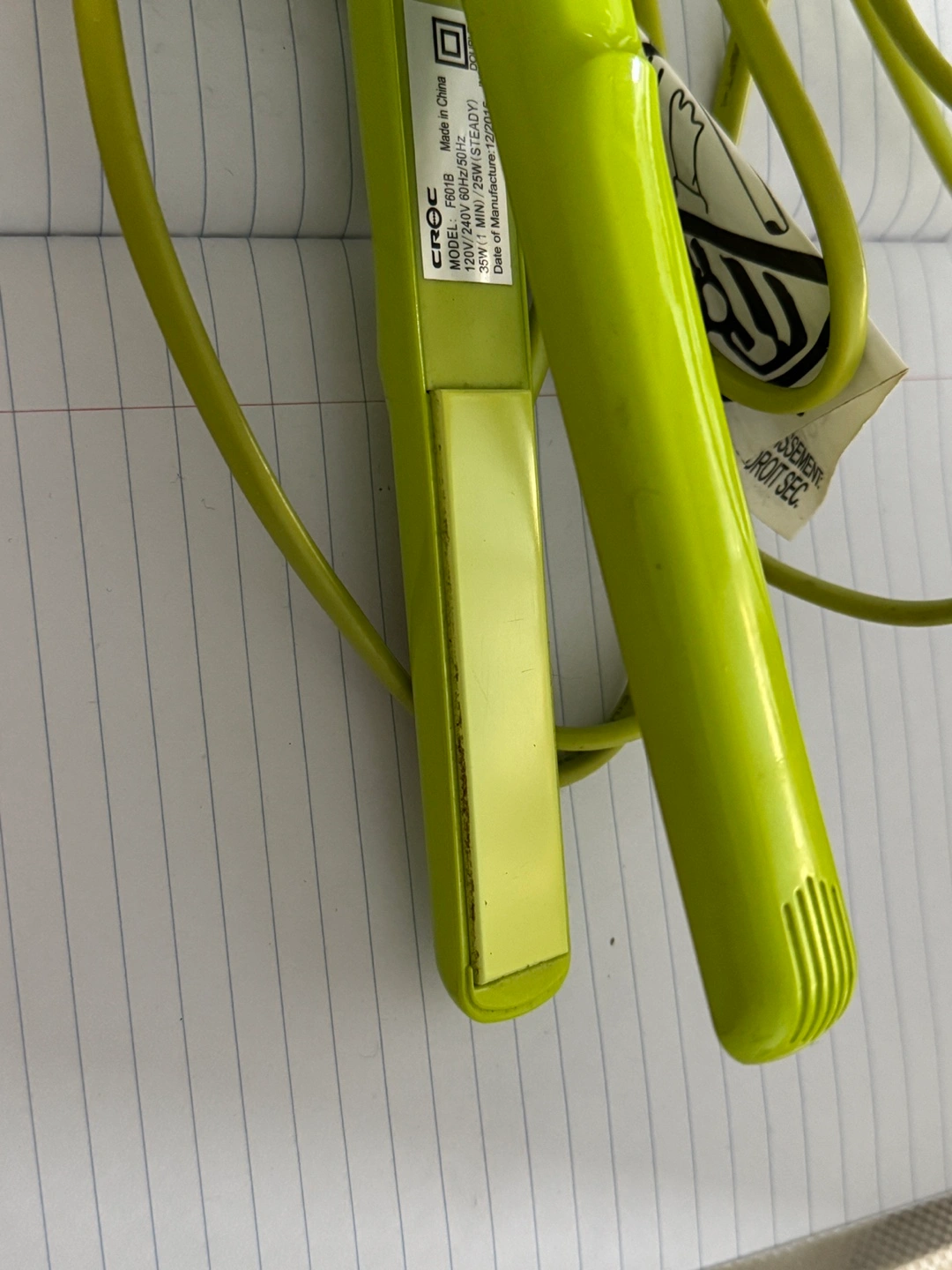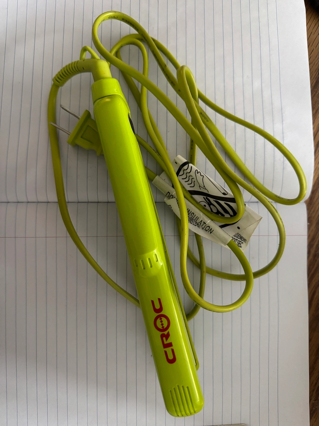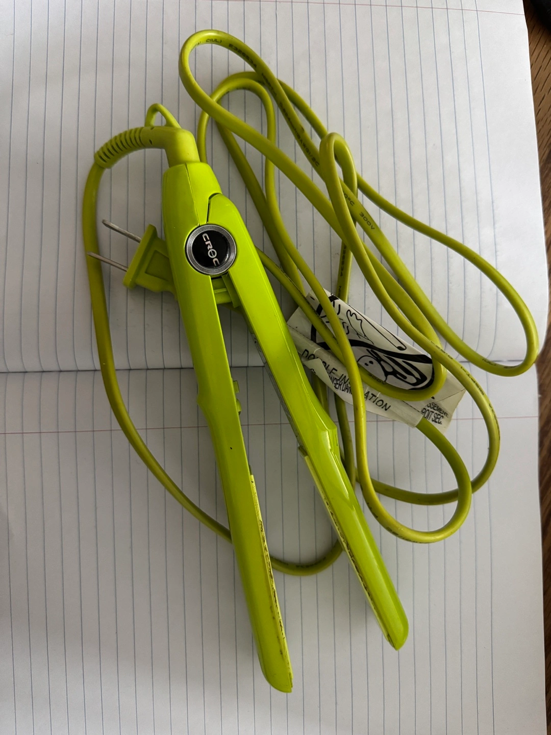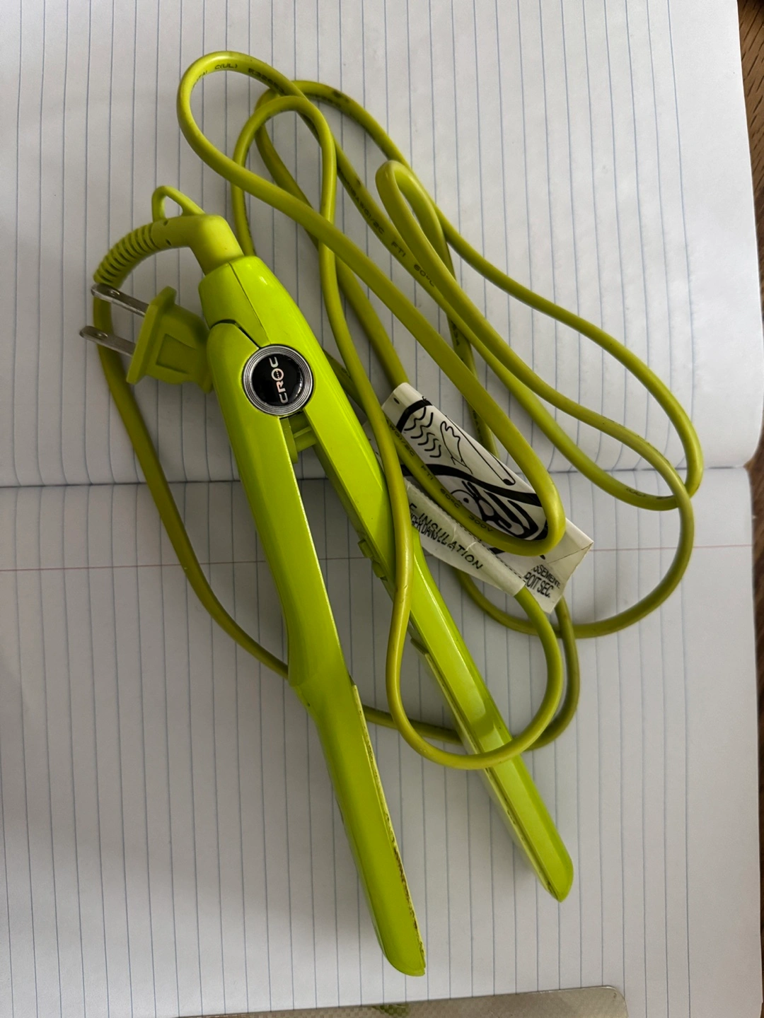 Pre-owned Croc mini flat iron. Lime green colour. Includes power cord. Shows some minor wear, was used only a handful of times on shorter hair and for touch ups. Great for travel use