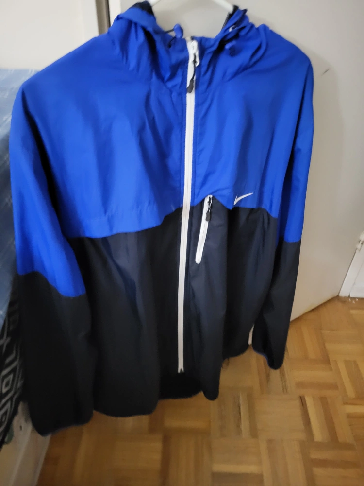 Men's Nike windbreaker jacket. Size XL. Blue and black colour block design. Full zip closure. Mesh lining at hood.