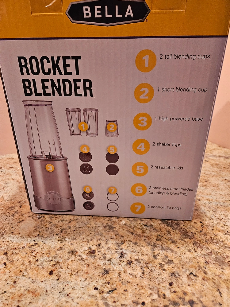 New in box. Blends, chops, and grinds. Includes 2 tall blending cups, 1 short blending cup, high powered base, shaker tops, resealable lids, and stainless steel blades. BPA-free and dishwasher safe.