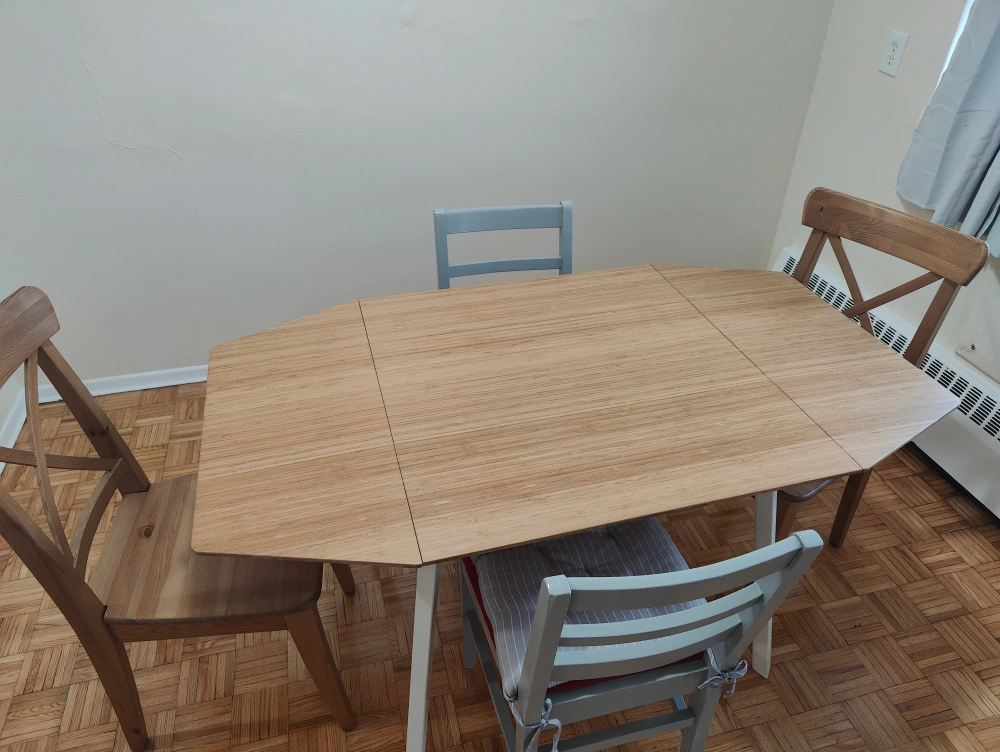 Ikea pinntorp dining table and four chairs - the dining table leaves can be folded down; table legs can also come off to easily fit it in your car.