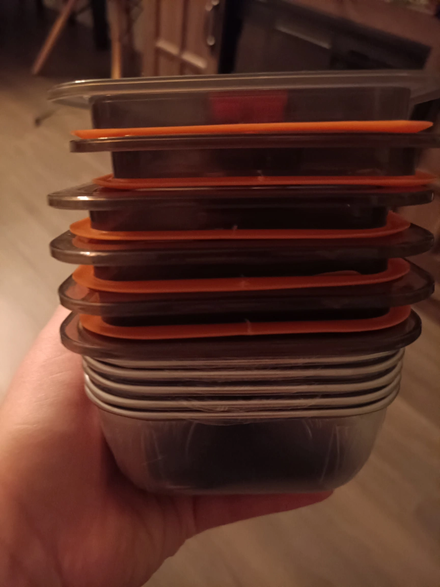Set of six stainless steel food storage containers. Each container includes a dark grey lid with an orange silicone seal. Perfect for meal prepping or storing leftovers. Measurements provided in image.