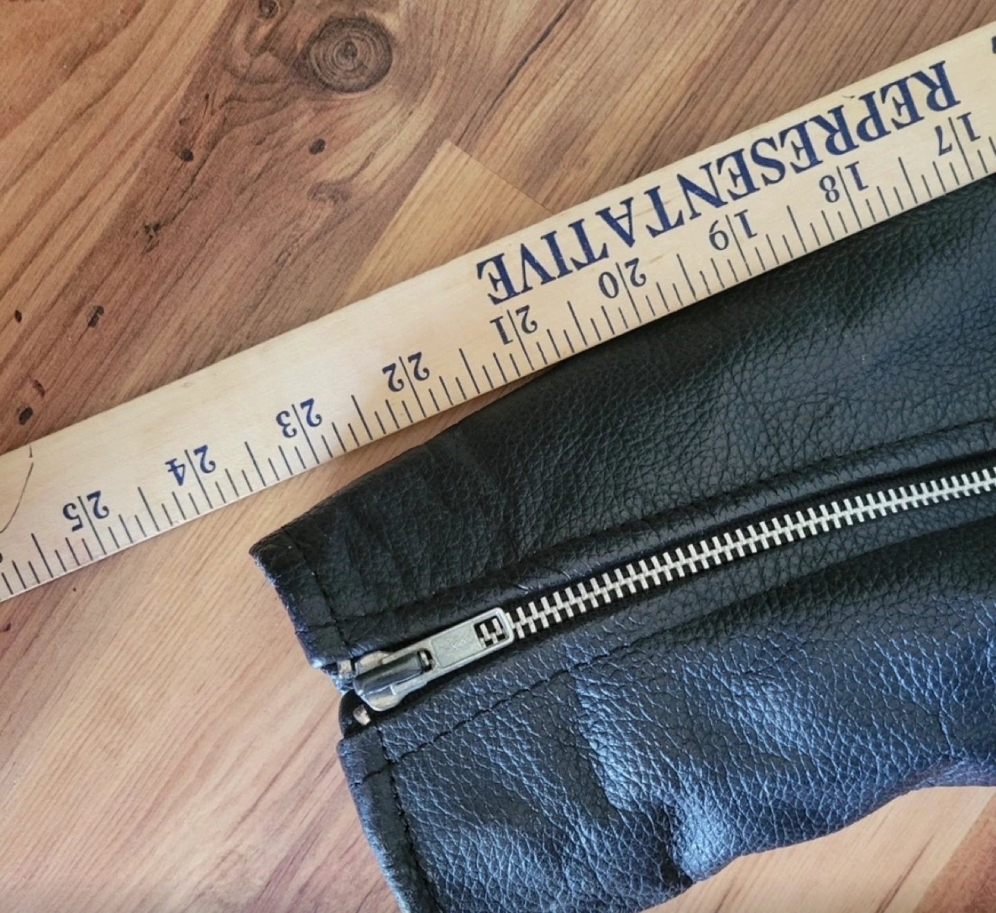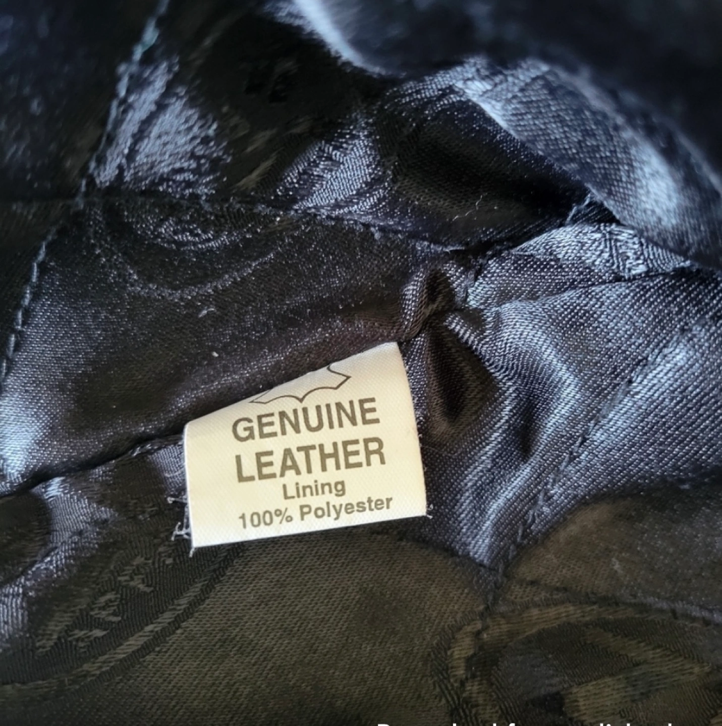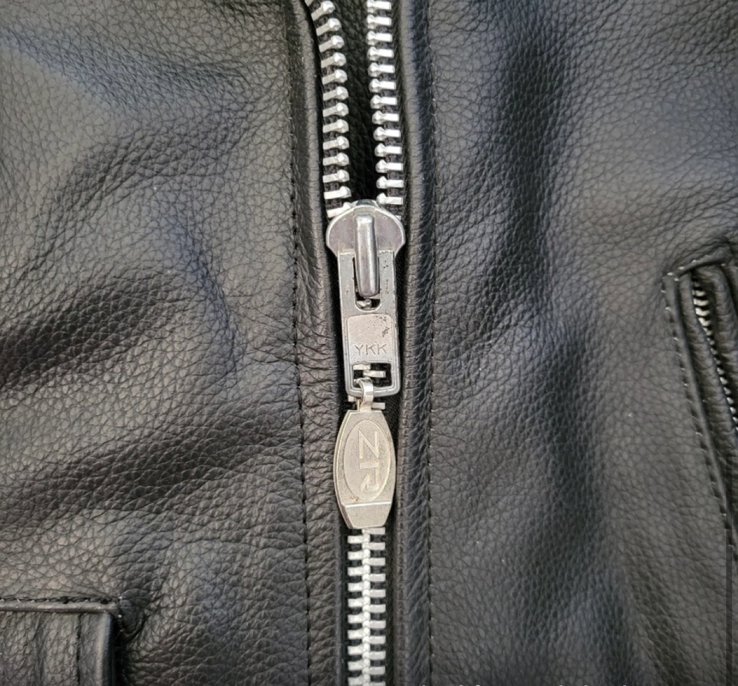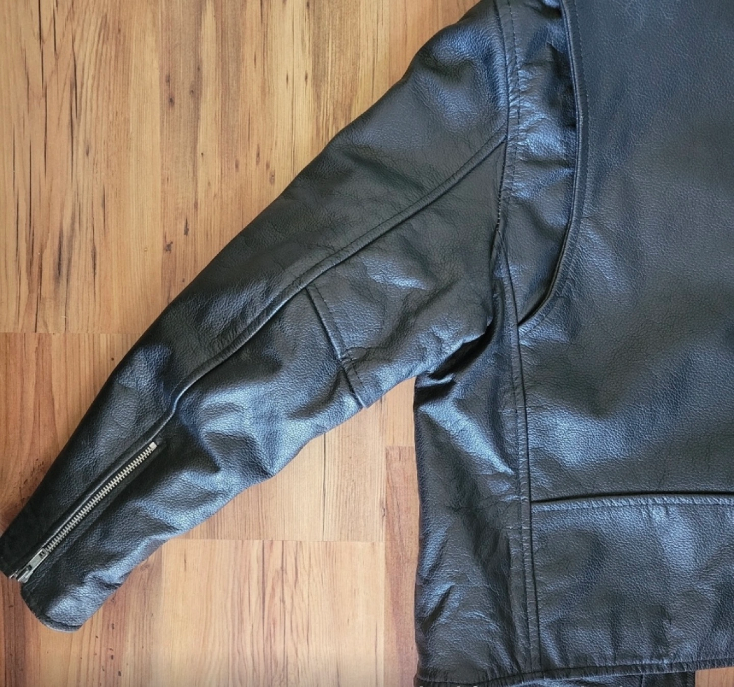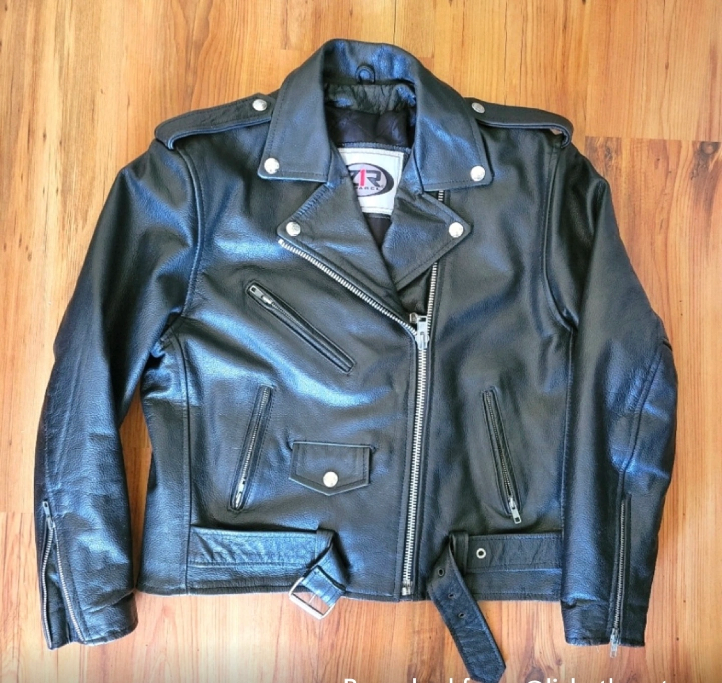 Genuine leather motorcycle jacket. Size 12. YKK zipper. Polyester lining. Multiple pockets. Classic biker style.
