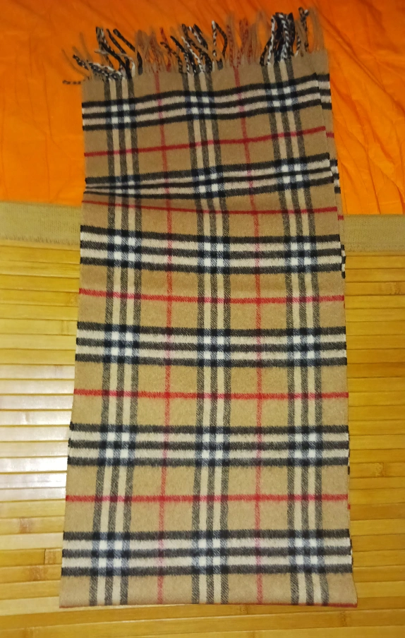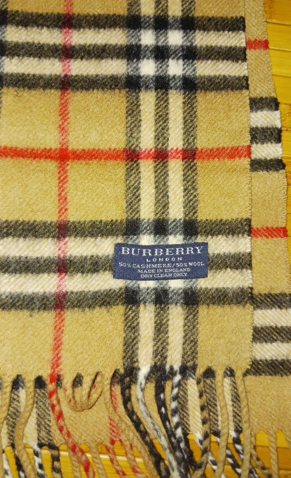 pre loved burberry half cashmere and half wool scarf. In good condition, made in England.