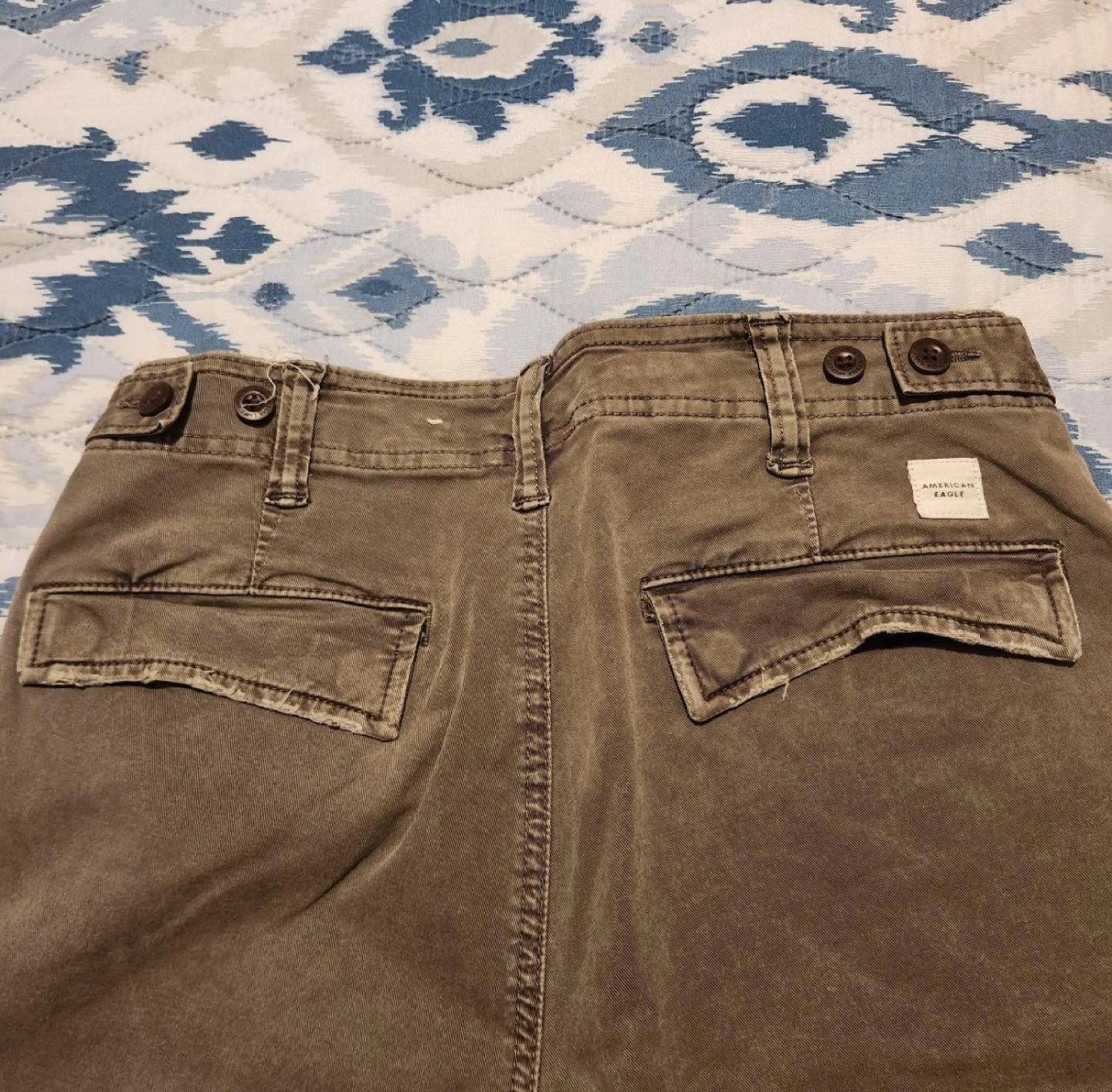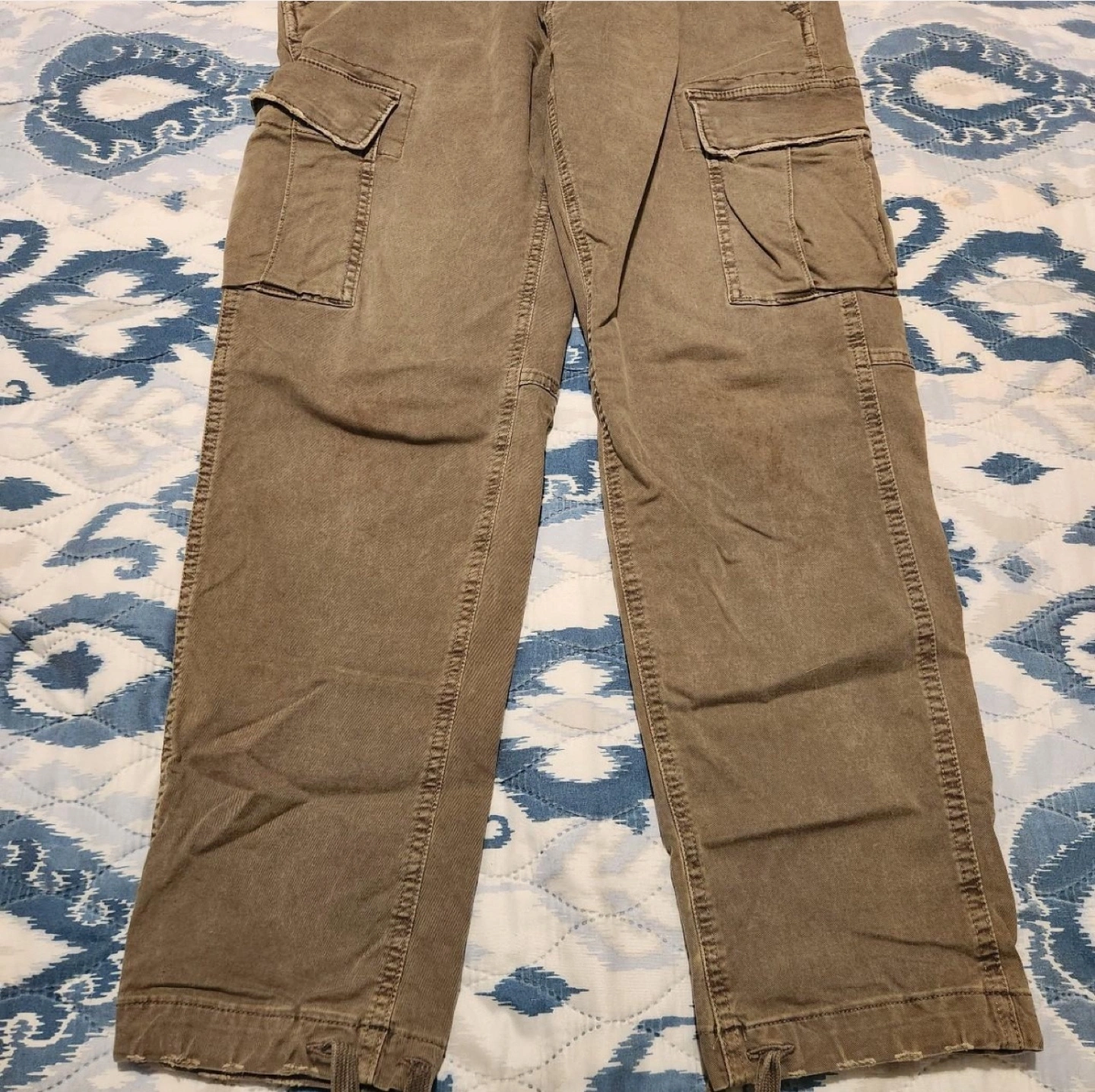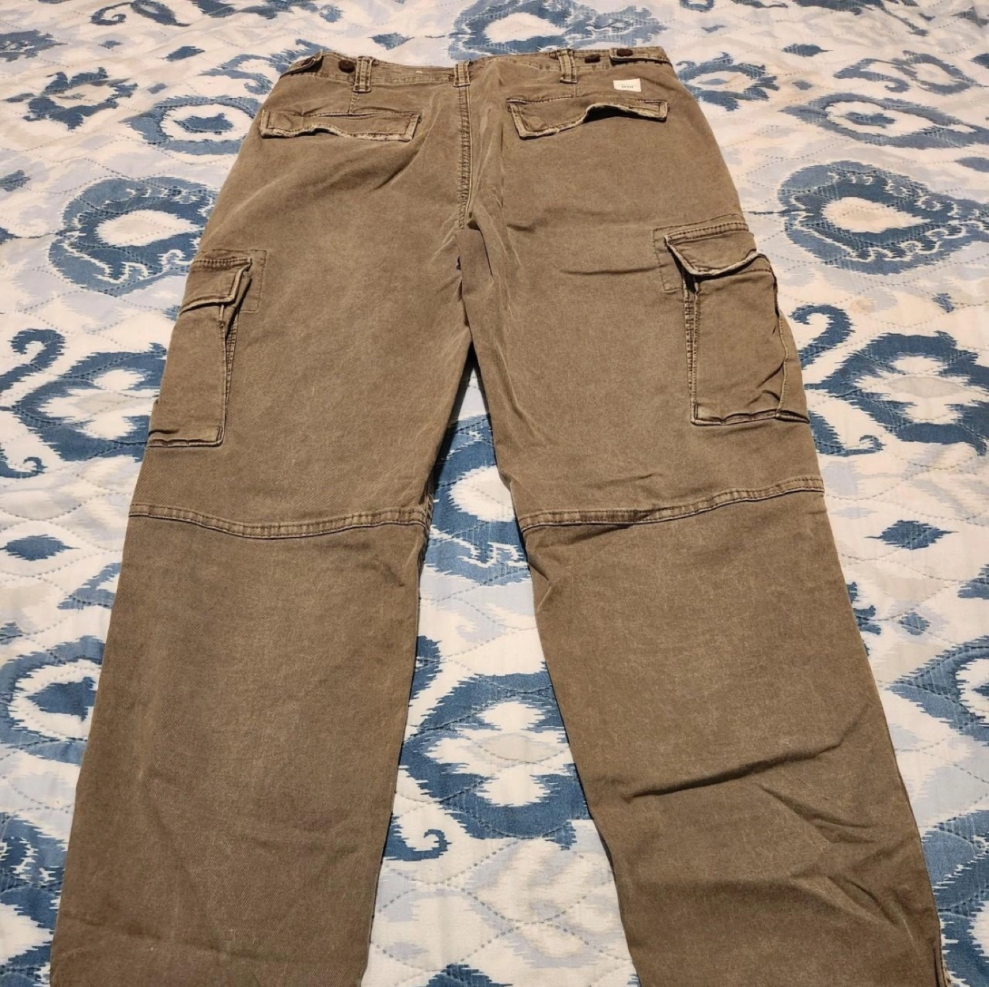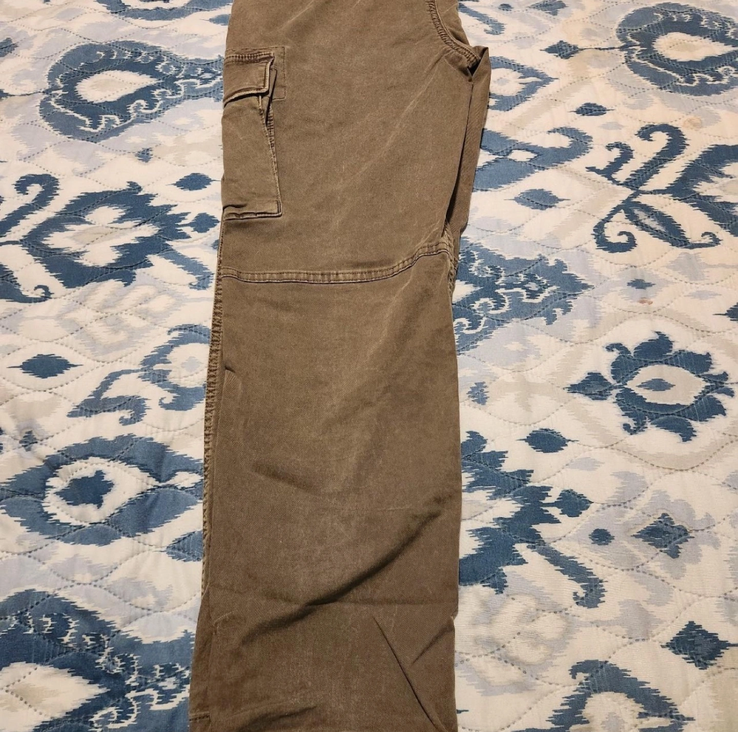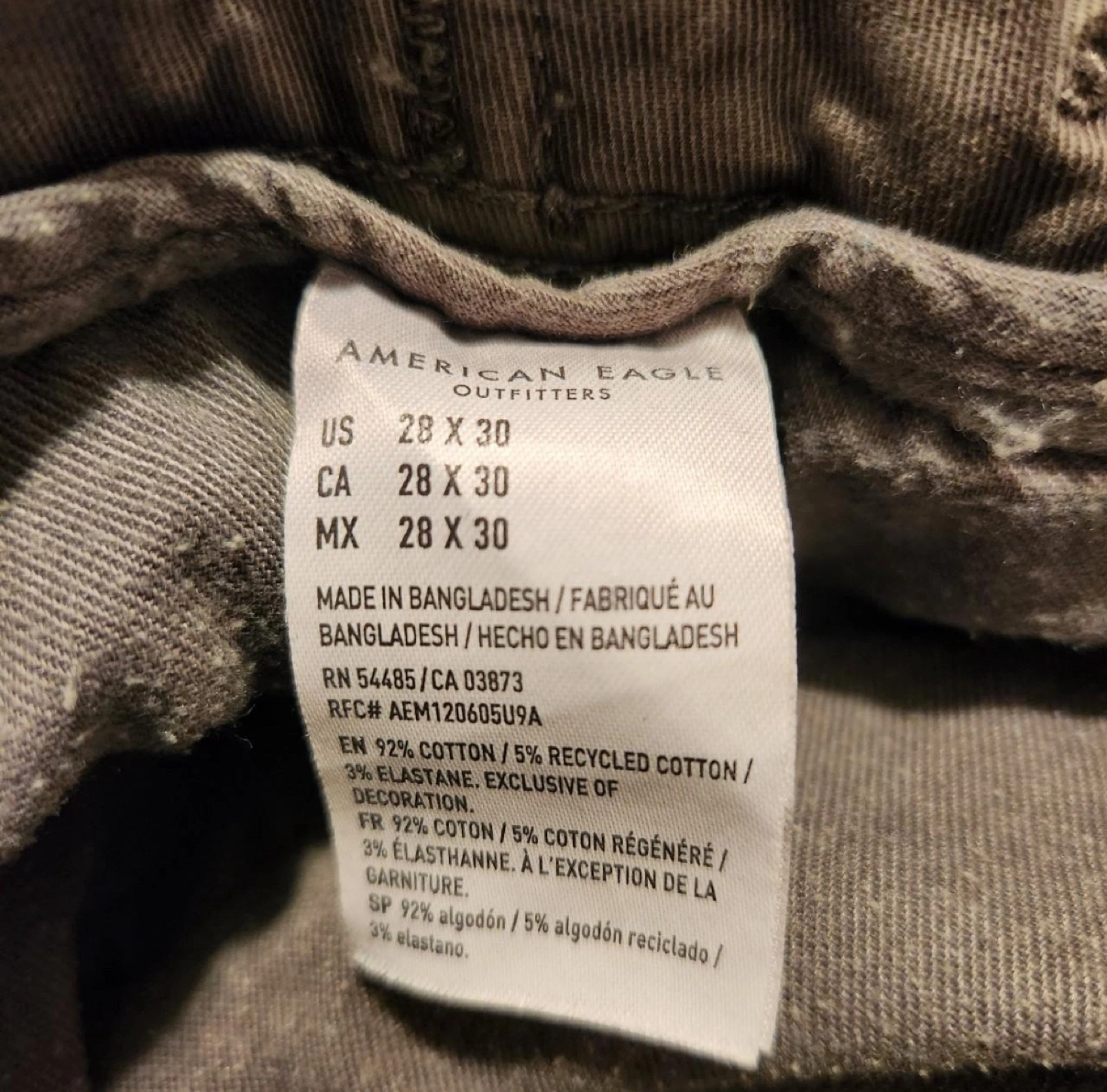 Men's cargo pants. Size 28x30. Multiple pockets. Olive green color. Made in Bangladesh. 92% cotton, 5% recycled cotton, 3% elastane.