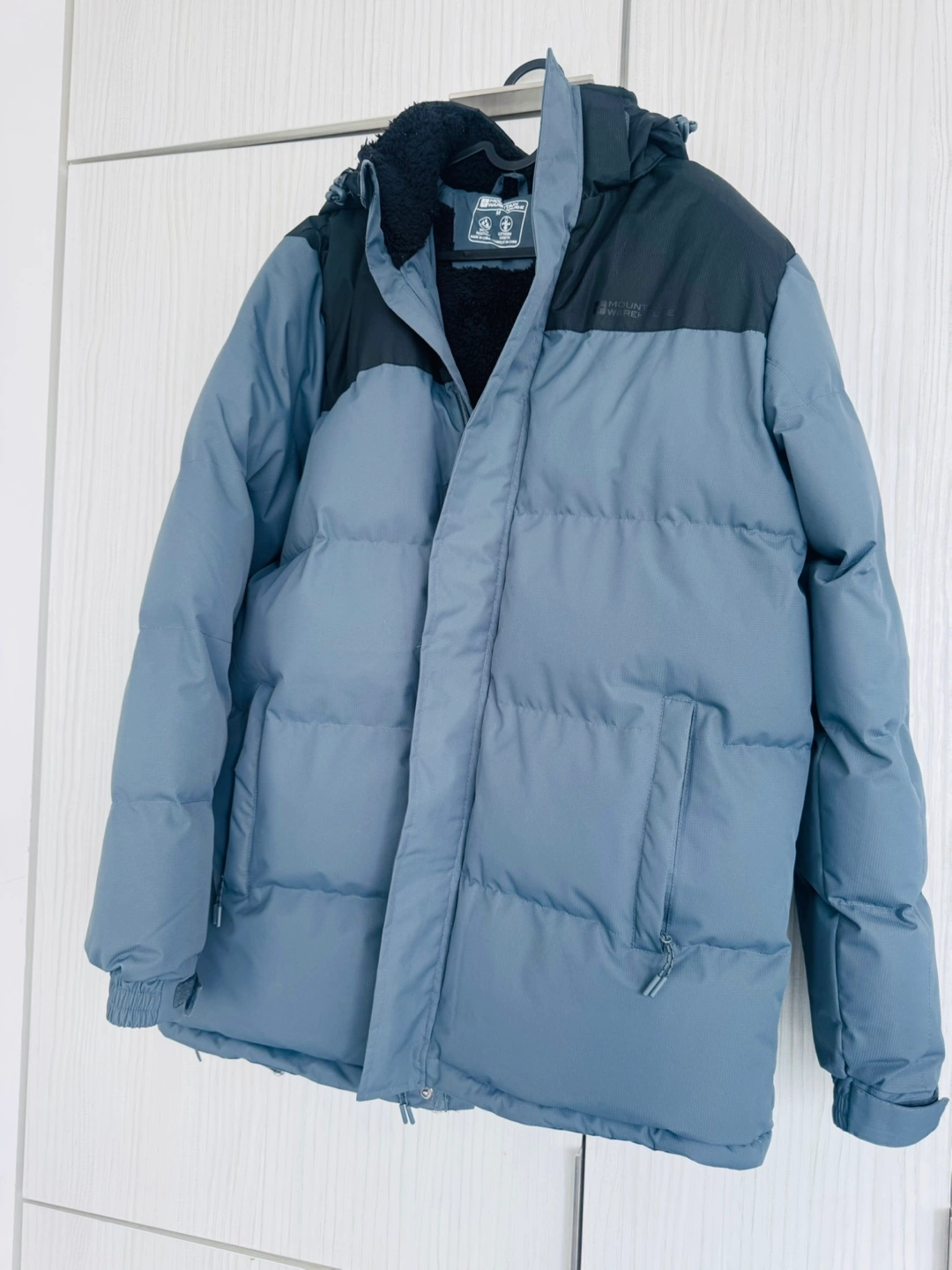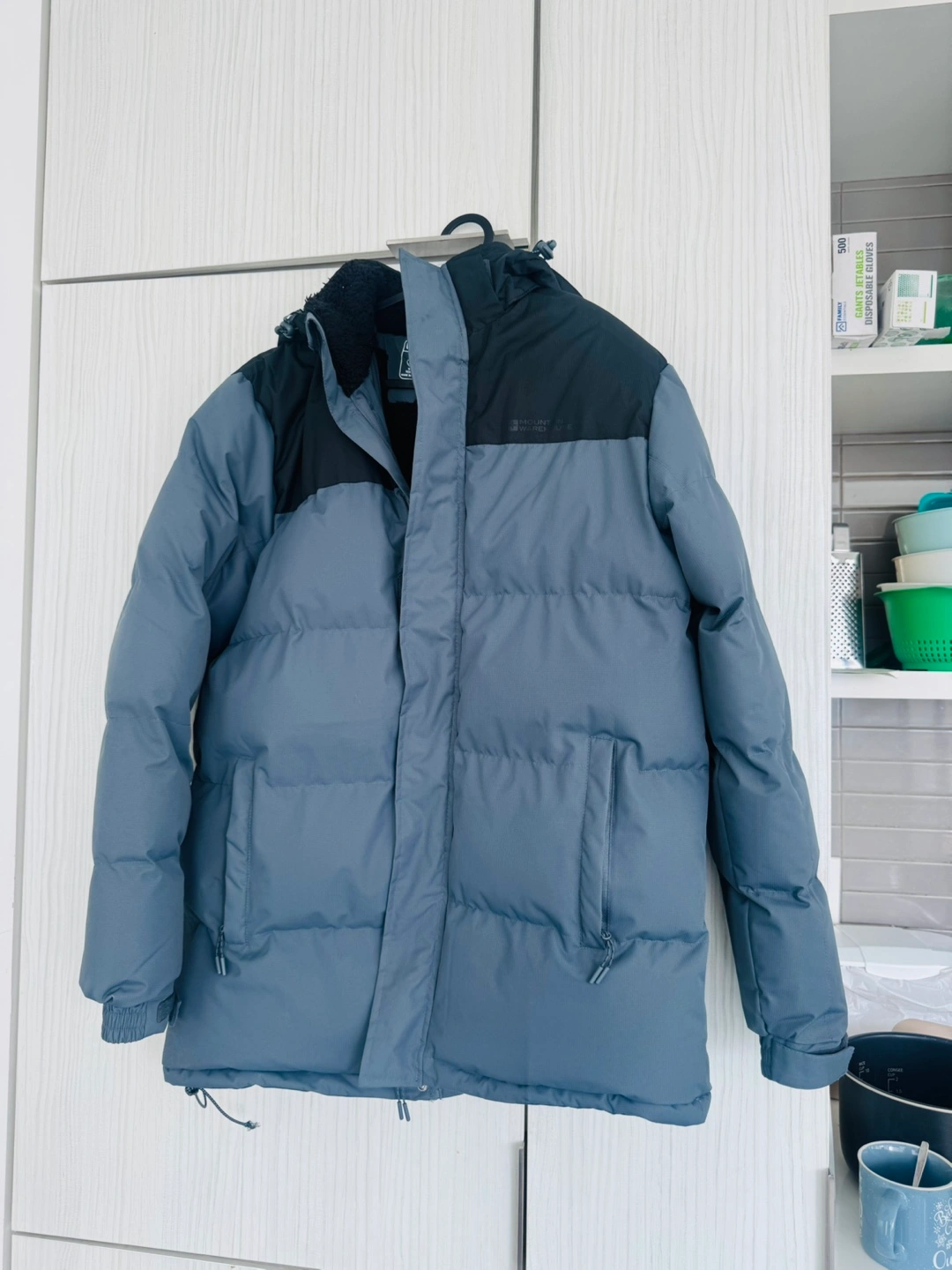 Men's winter puffer jacket. Features a hood and elasticated cuffs. Water resistant.