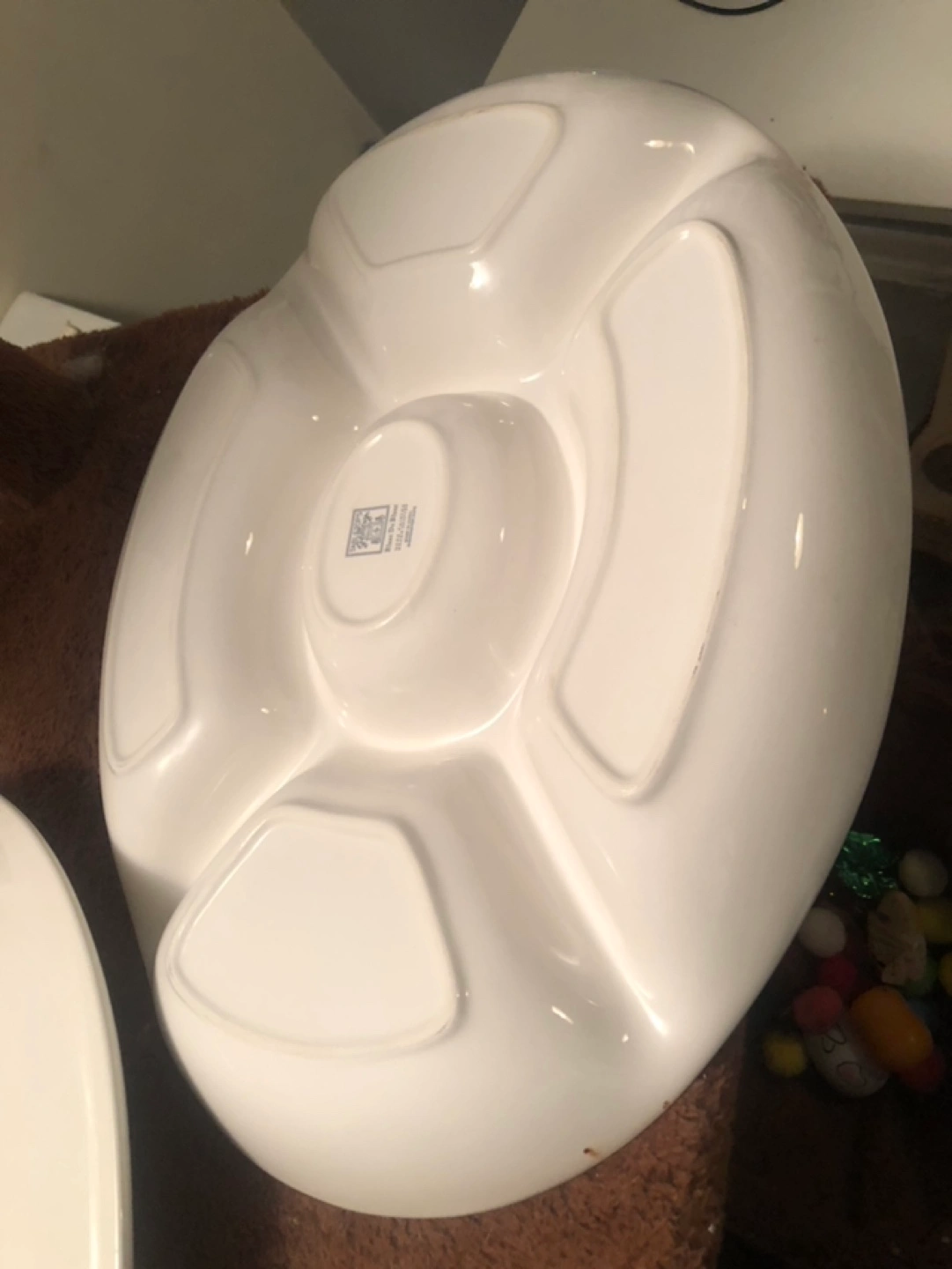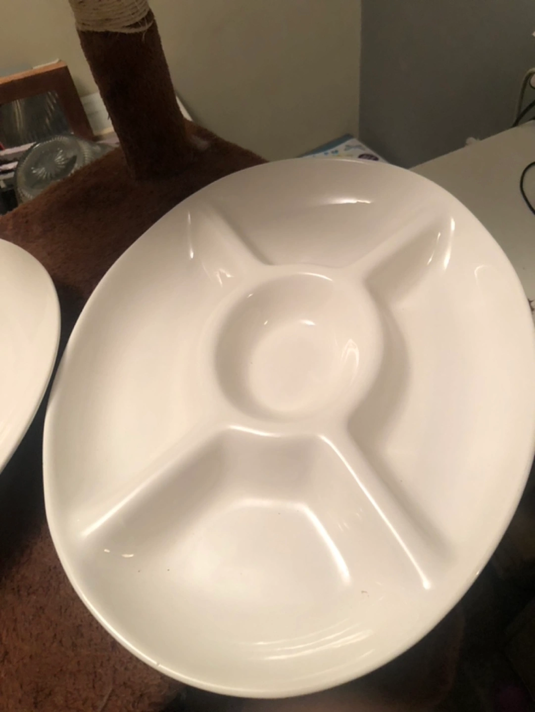White ceramic divided serving platter. Five sections, perfect for snacks or dips. Hand-painted and hand-crafted. Dishwasher safe.