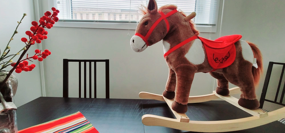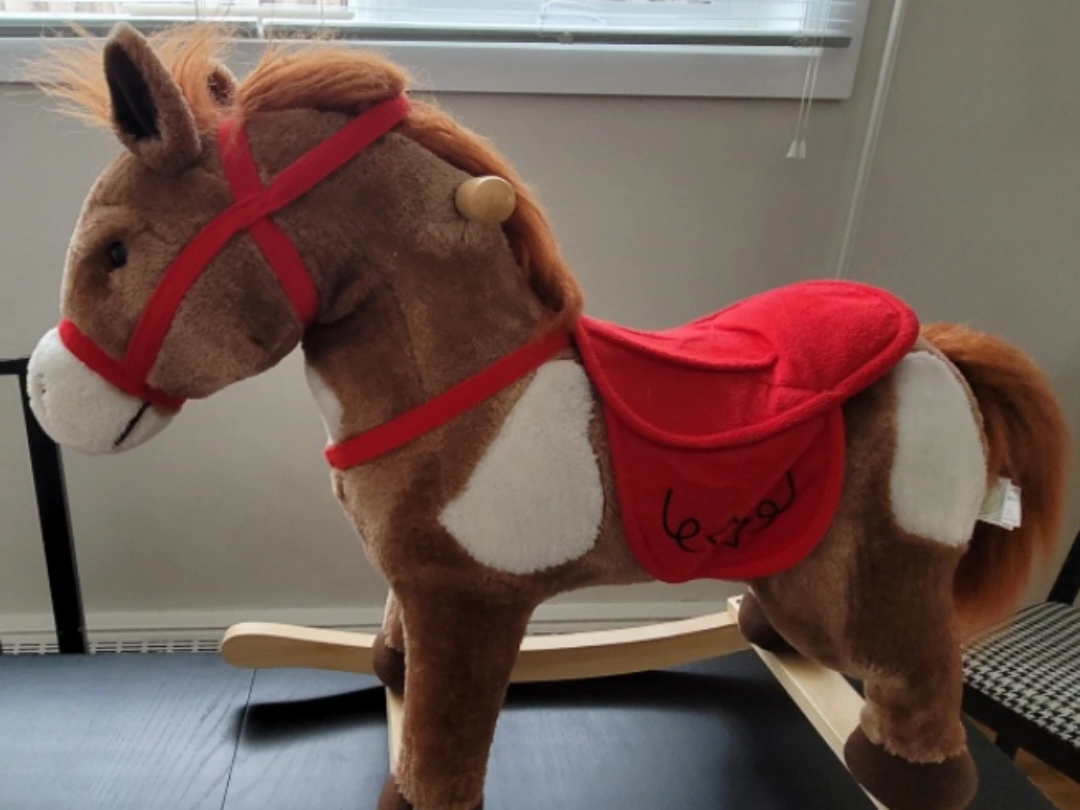 Brown and white plush rocking horse. Red saddle and bridle. Wooden base. Gently used.