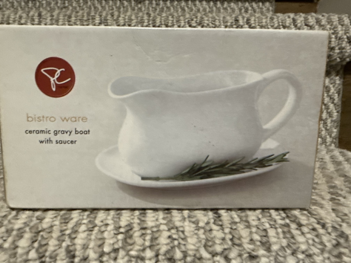 White ceramic gravy boat and saucer set. Part of the PC Bistro Ware collection. Like New in box.