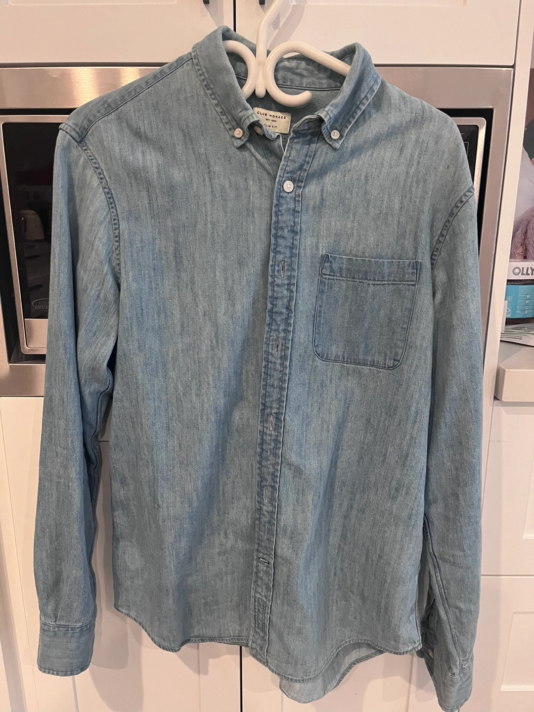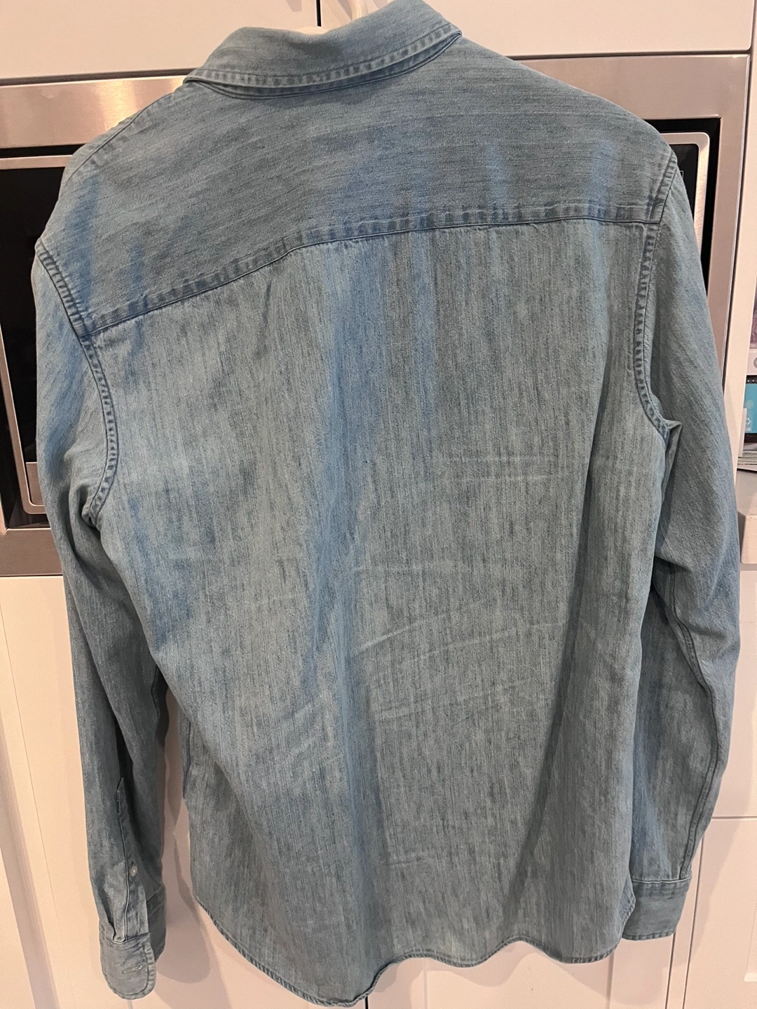 Long sleeve denim button-up shirt. Light wash denim. One chest pocket. Good condition.