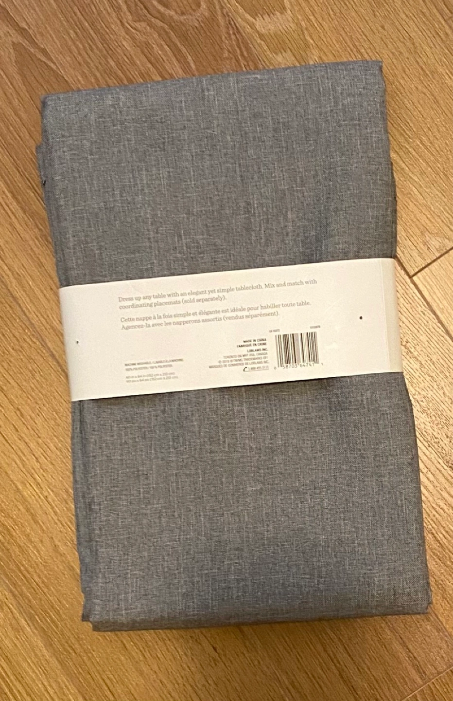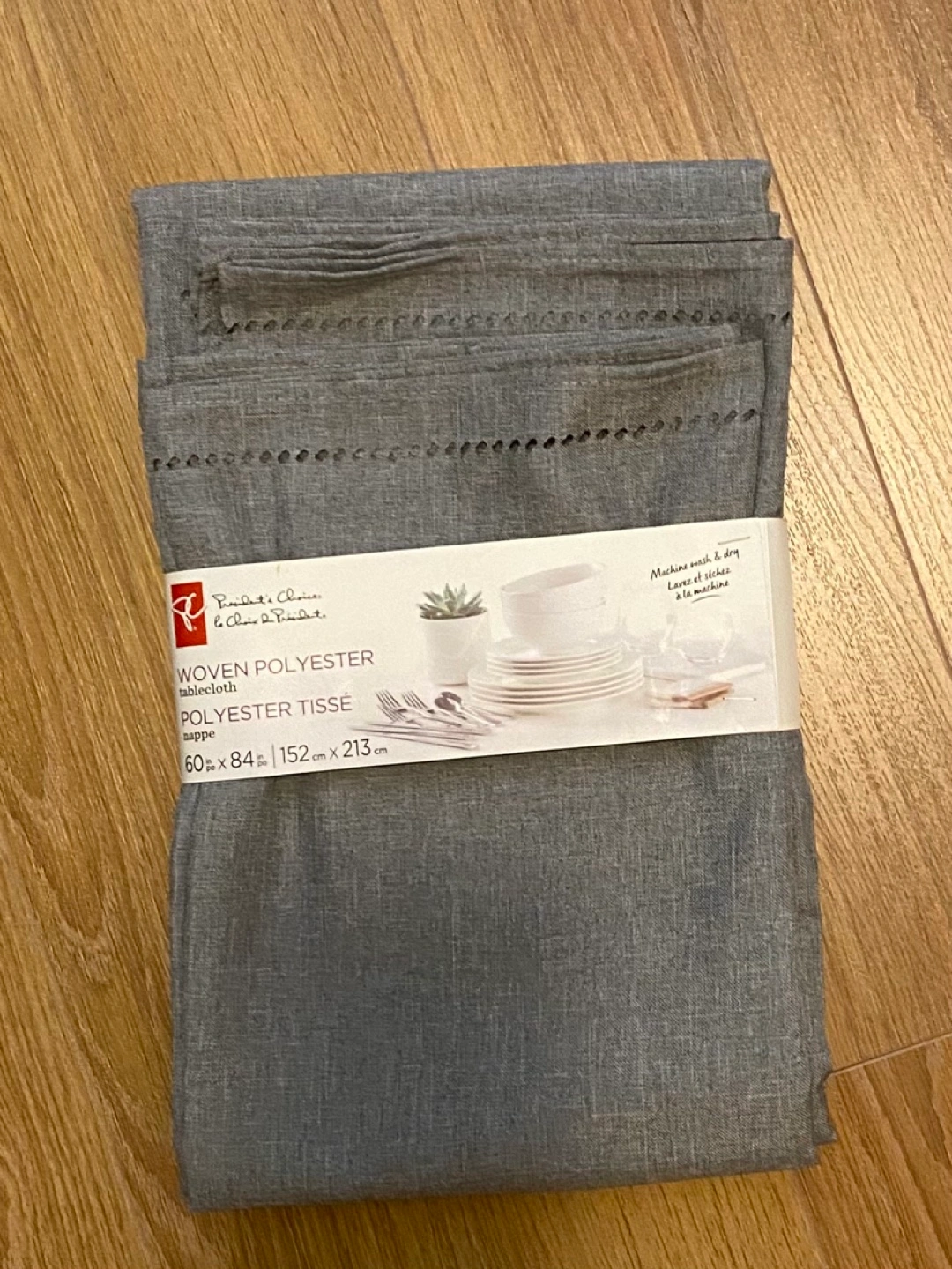 Brand new, never used. Grey woven polyester tablecloth. Measurements: 60 x 84 inches (152 x 213 cm). Machine washable and dry. Simple and elegant design.