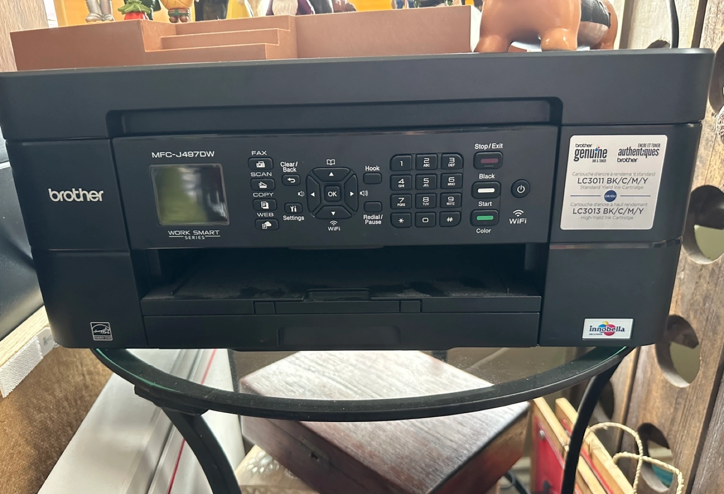 All-in-one printer, scanner, copier, and fax machine. Wireless functionality. Model MFC-J497DW. Work smart series. Good working condition. Ink needs to be replaced.