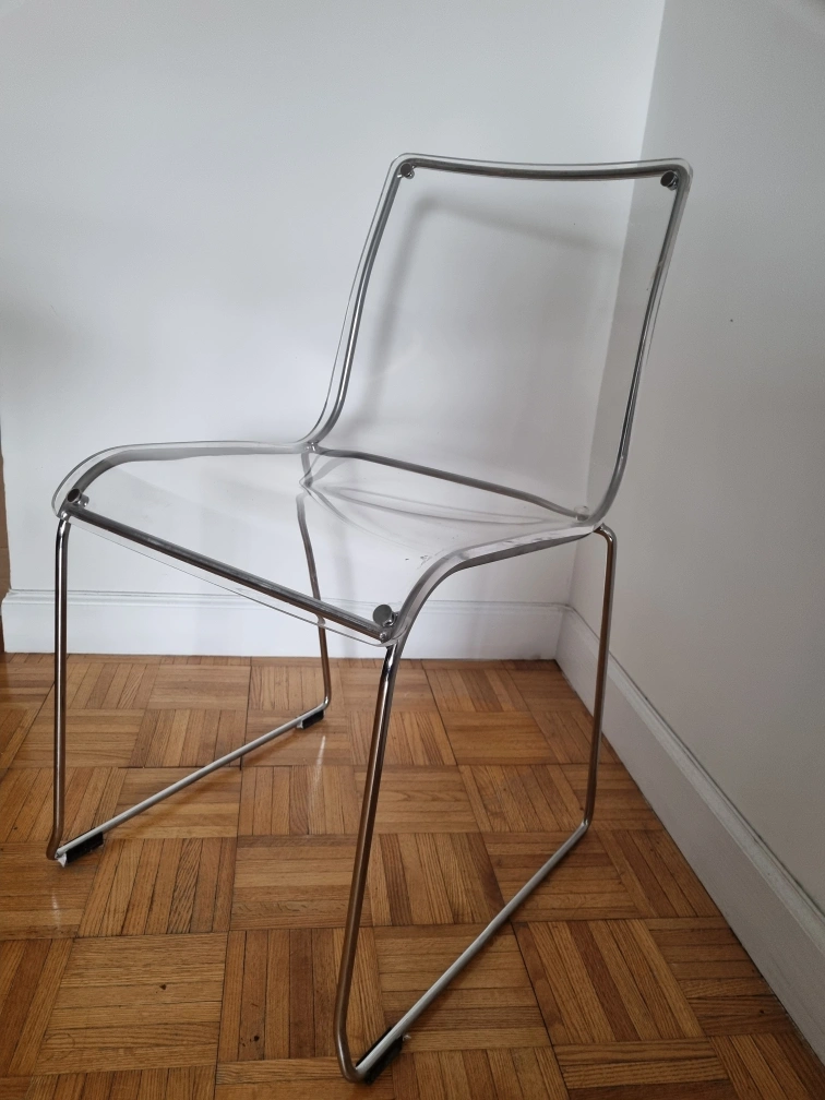 Modern dining chairs. Transparent acrylic seats and backs. Chrome metal legs. Minimalist design. Suitable for kitchen or dining room.