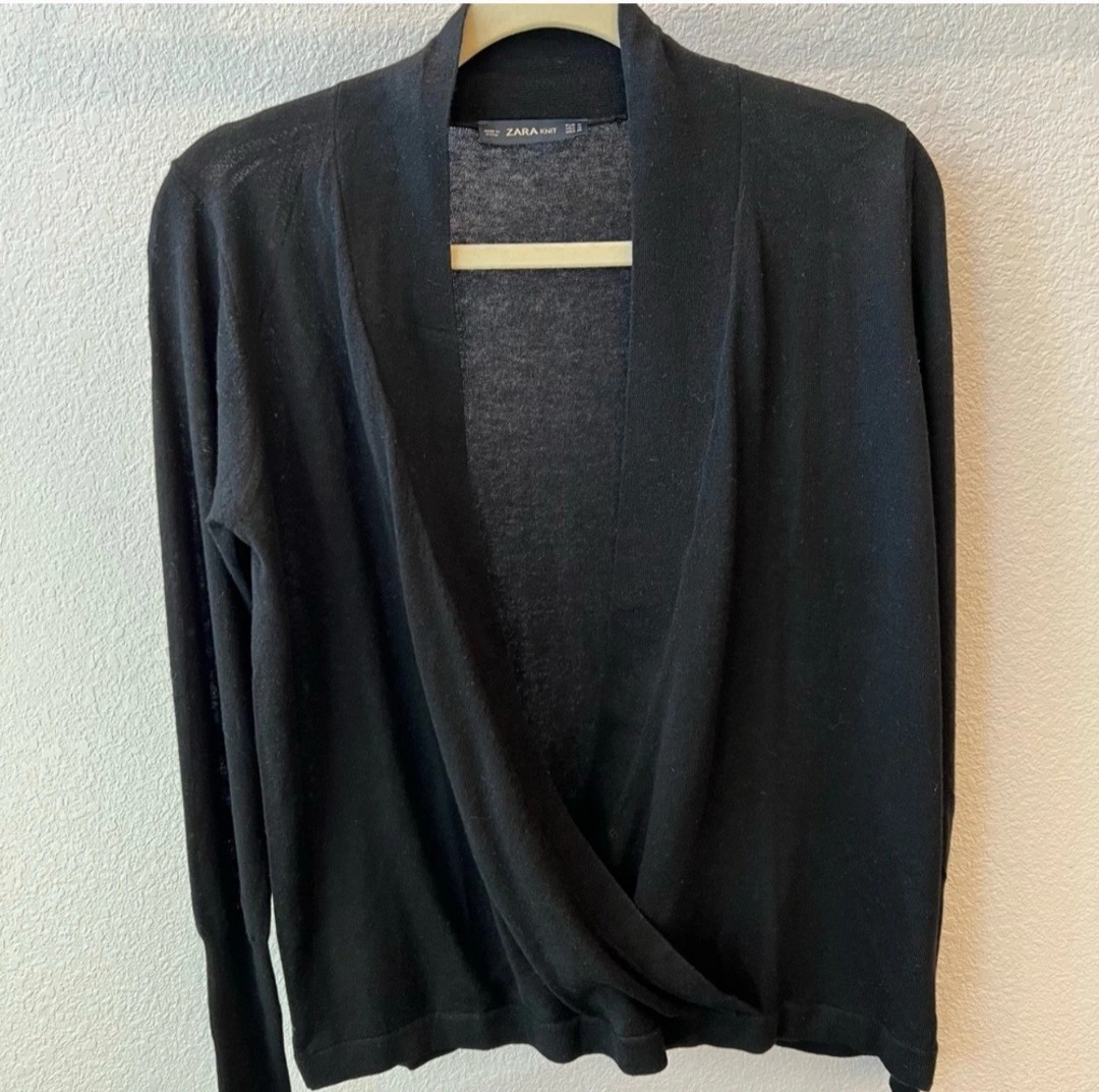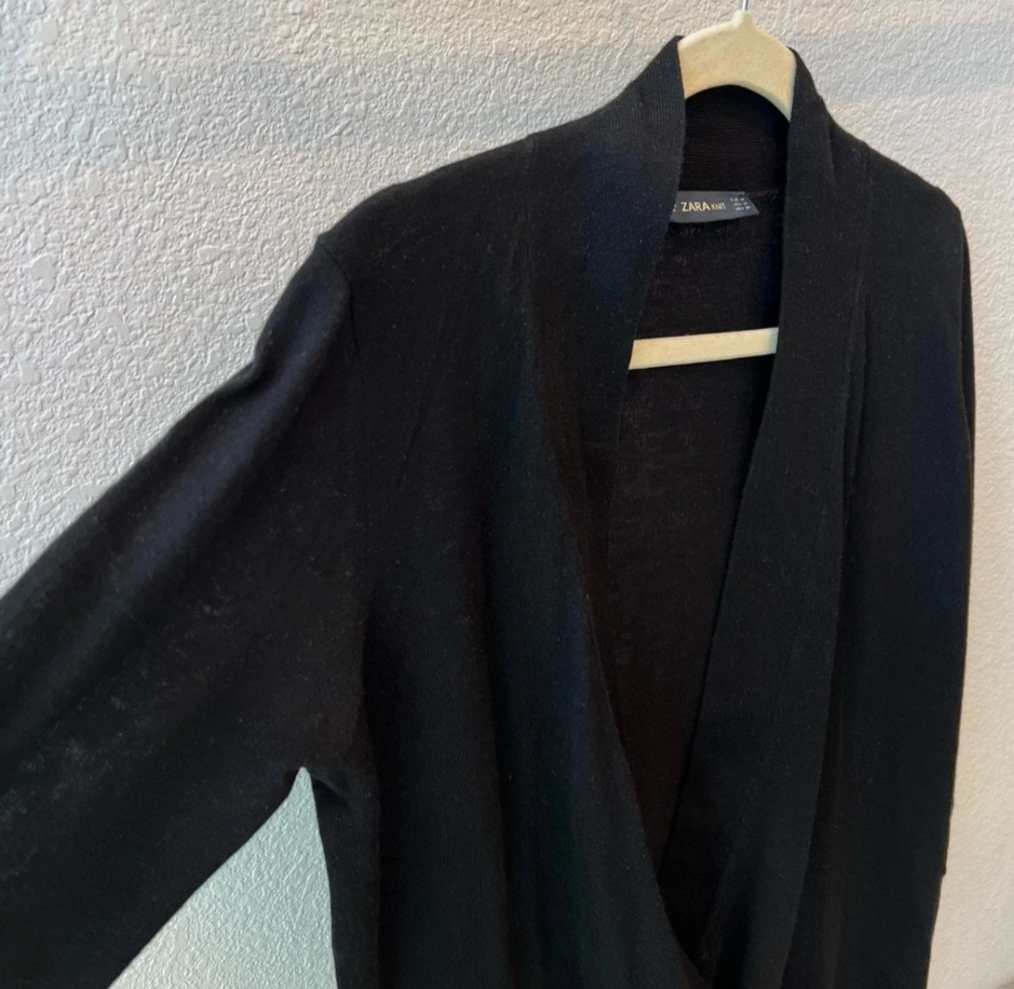 Zara black faux wrap wool blend sweater. Open v-neck drapes down to the waist where the wrap joins the waistband. Long sleeves that have an extra large cuffs that hugs the forearms. Comfortable and fashionable at the same time. Women's size medium. Machine washable. Good overall condition but has a couple of small snags on the back side.