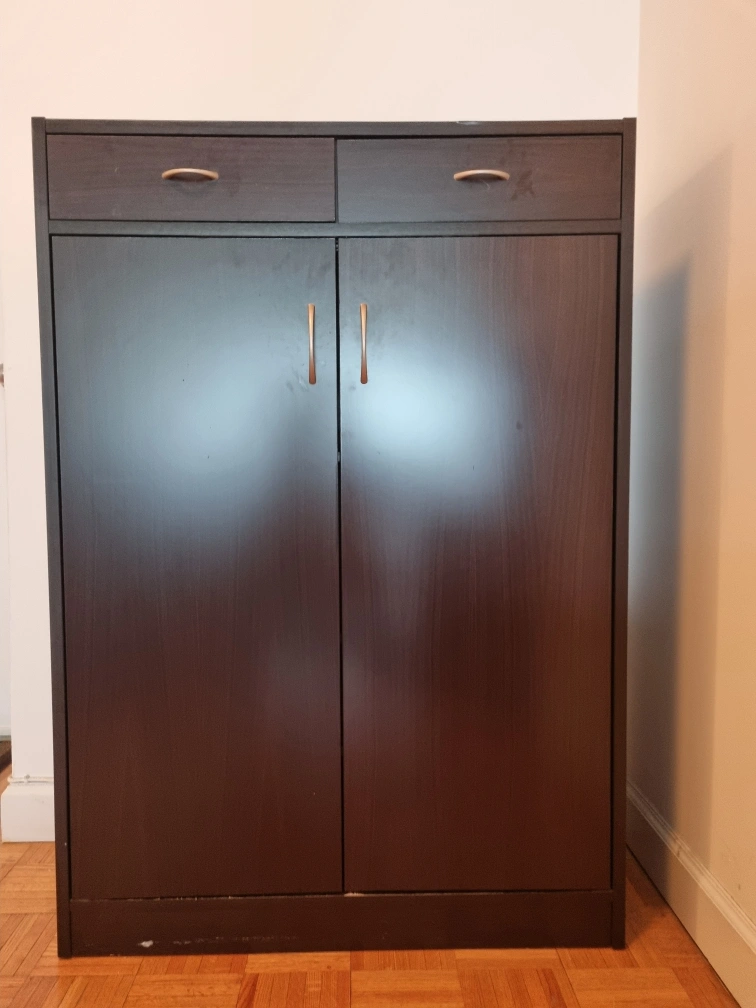 Tall shoe cabinet. Two drawers and two doors. Dark brown wood. Some minor wear.