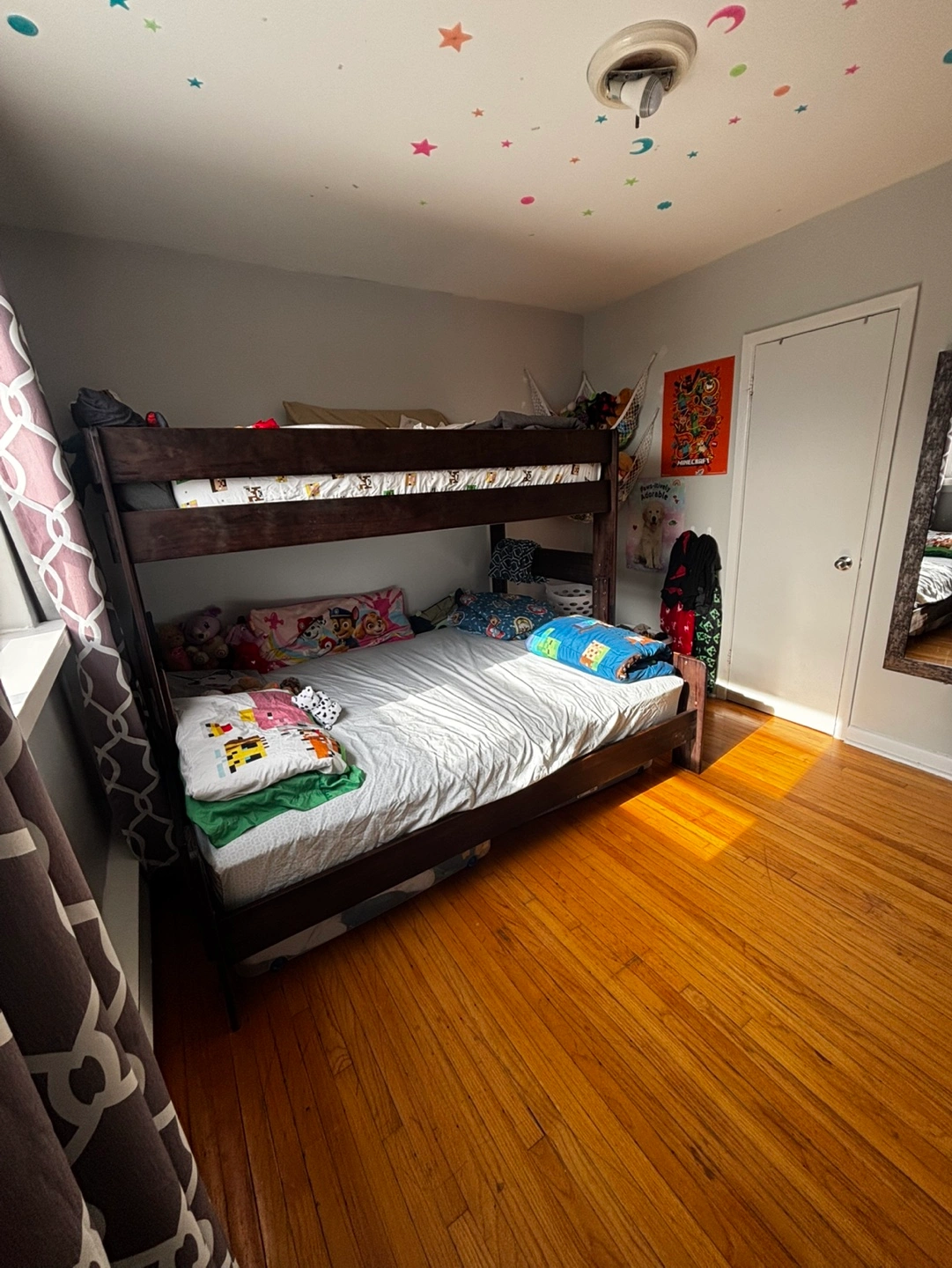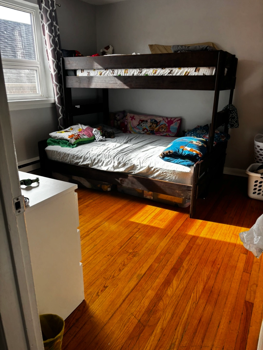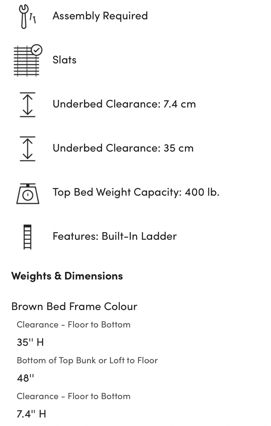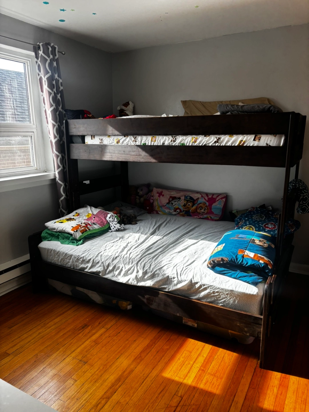Solid wood bunk bed. Dark brown finish. Built in ladder. Used for about 1 year.