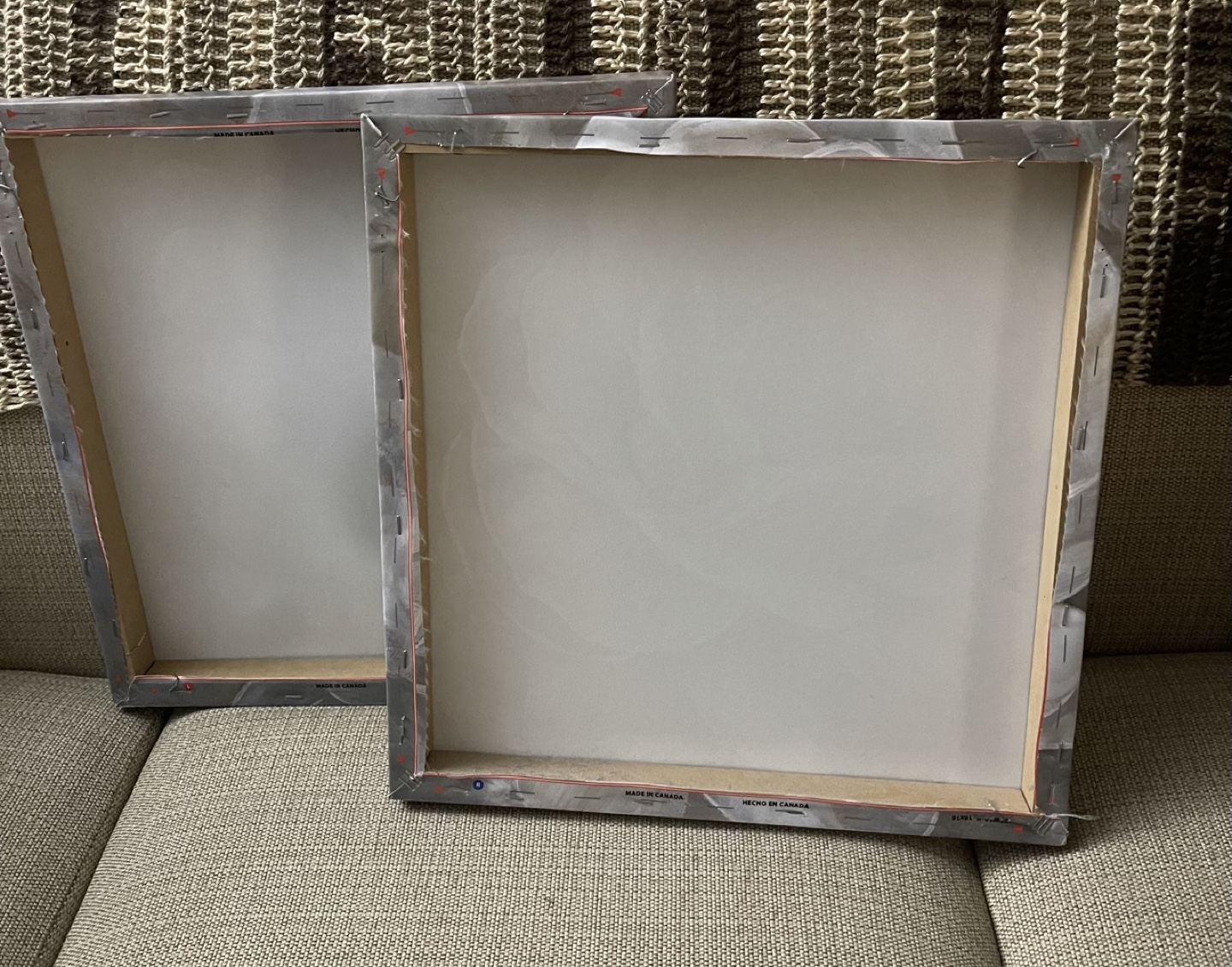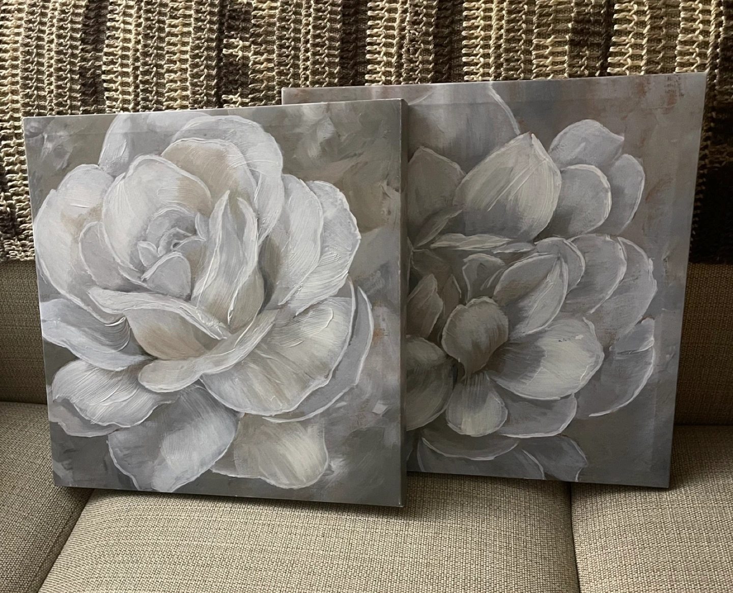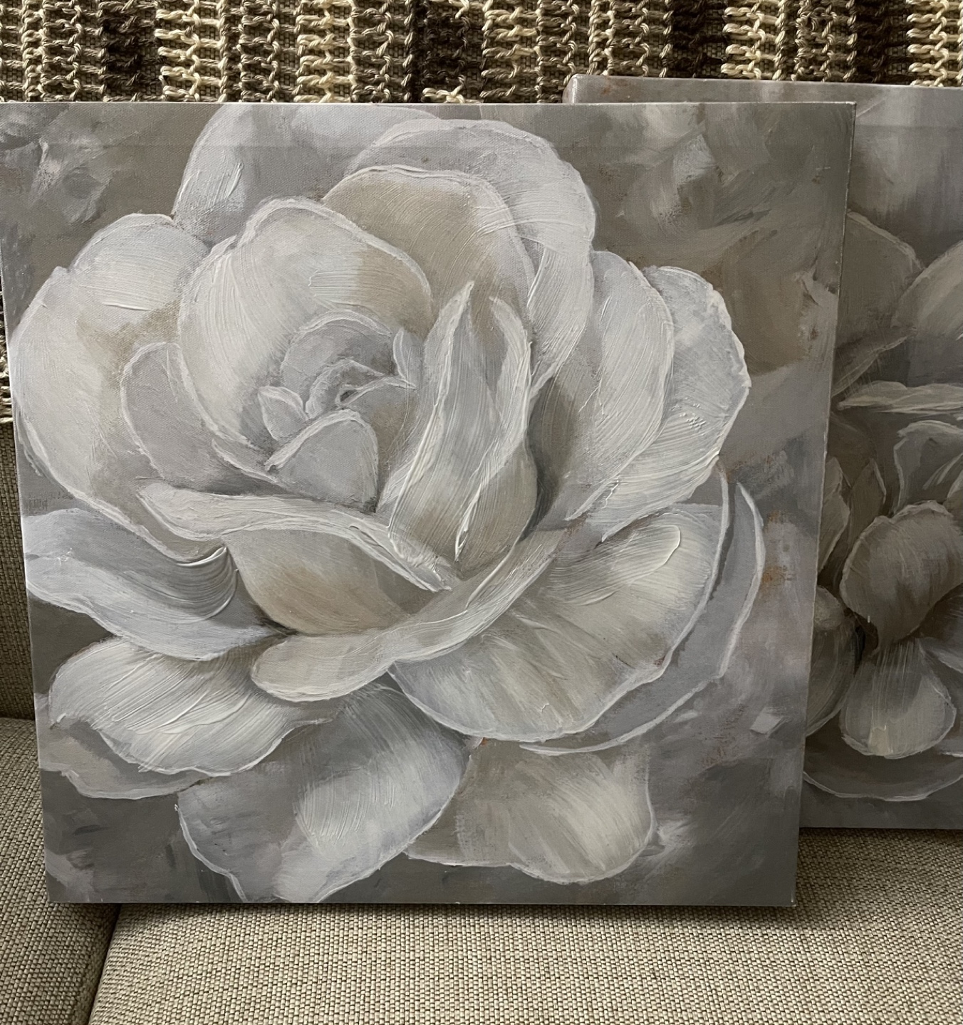Set of two square canvases. Features a large grey and white flower.