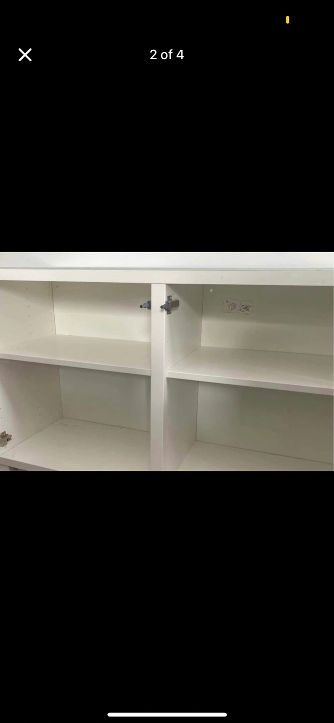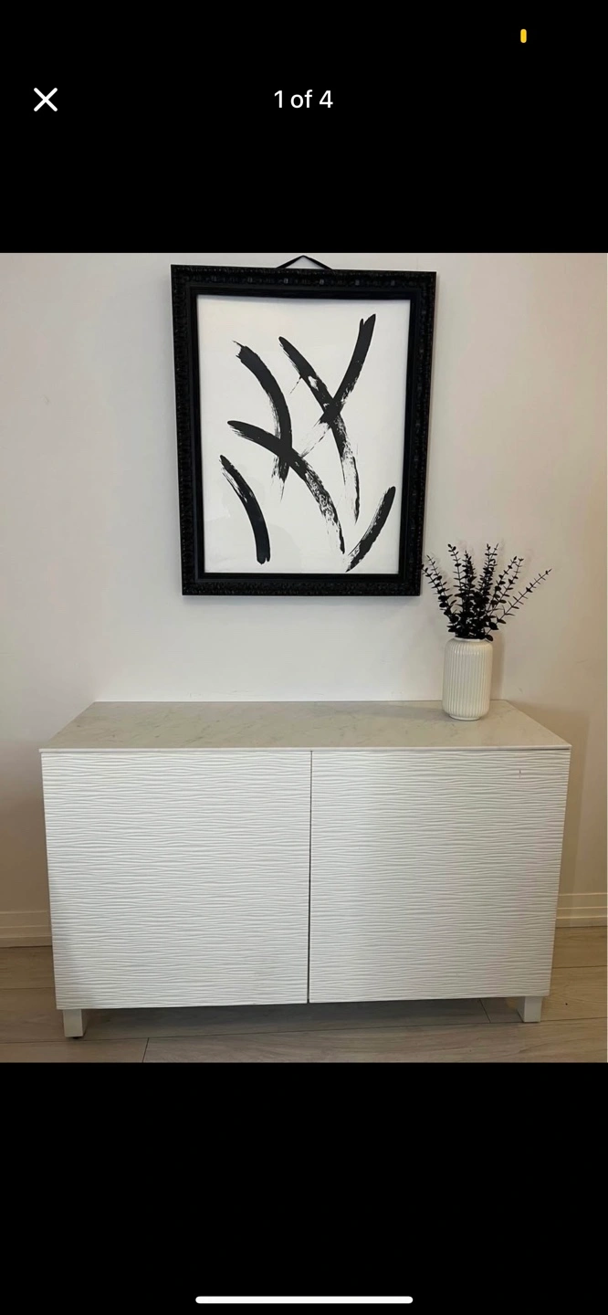 White shelf unit with two doors. Plenty of storage. Good condition. Measurements: 120x42x64 cm (47 1/4x16 1/2x25 1/4").