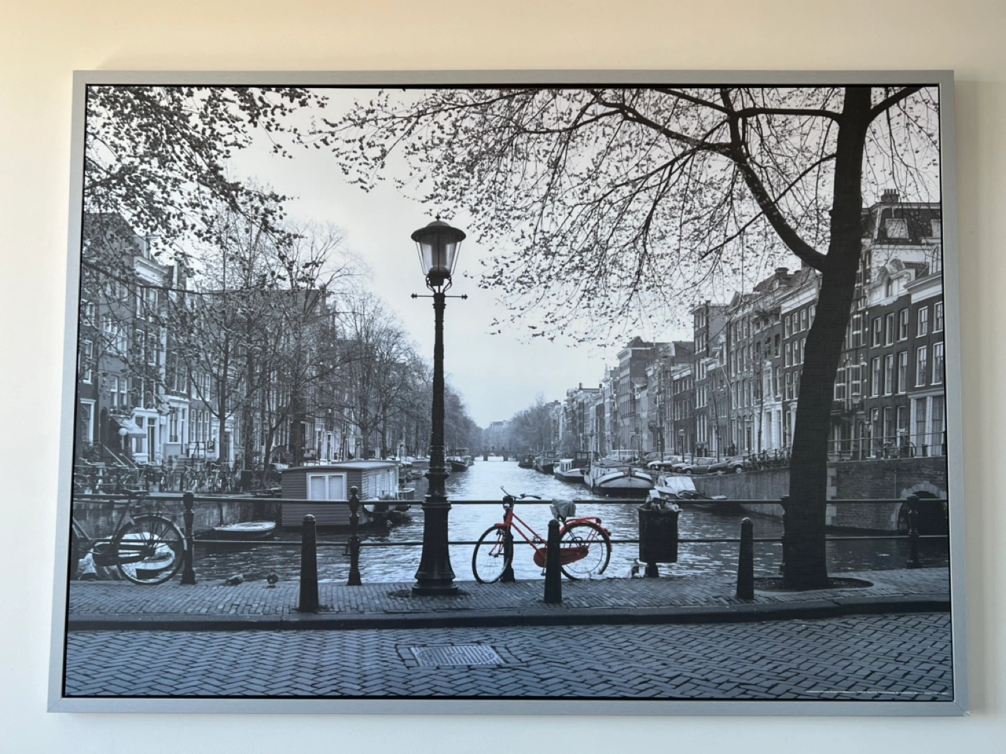 Large framed canvas print. Black and white image of Amsterdam canal.